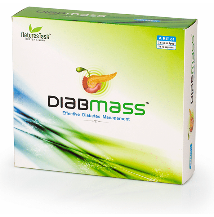 Diabmass (A Kit of 2x150ml Syrup and 3x10 Capsules) DIABMASS is a simple and effective way to manage diabetes. Its natural ingredients and formulation targets and manages high blood sugar levels. Regular use of DIABMASS helps in managing blood glucose metabolism and strengthens functioning of vital organs. Key Ingredients: Amra Guthali Chirayata Kutki Karela Methi Amra