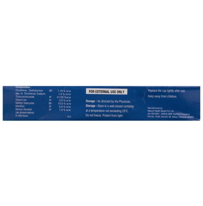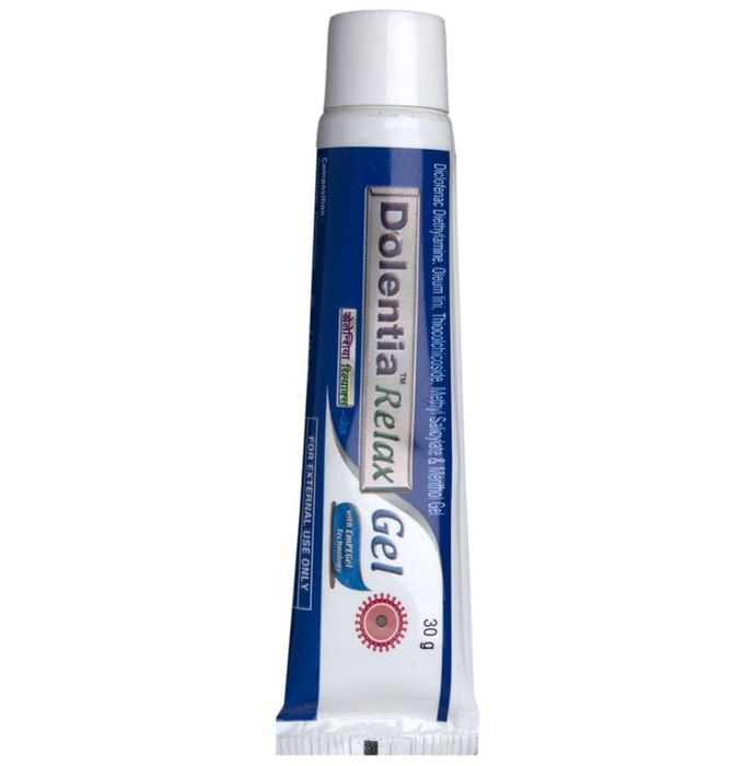 Dolentia Relax Gel is an analgesic anti-pyretic gel used for the treatment of fever and body ache. It is a topical medication that is applied to the affected areas. The gel comprises a non-steriodal anti-inflammatory drug that decreases the hormone which causes pain in the body. | Key Ingredients: Diclofenac Linseed oil Menthol Methyl salicylate Thiocolchicoside | Key Benefits: Diclofenac is a potent analgesic which relieves pain and inflammation Linseed oil acts as a local anesthetic that helps in reducing inflammation and enhances diclofenac absorption Menthol present in the gel also provided the affected area with a cooling effect The antipyretic ingredients help to eventually bring down the fever as well | Directions For Use: Use Dolentia Relax Gel as directed by the physician. | Safety Information: For external use only Do not freeze Replace the cap tightly after use Read the label carefully before use Do not exceed the recommended dose Keep out of the reach of children Store at a cool and dry place Should be protected from direct sunlight