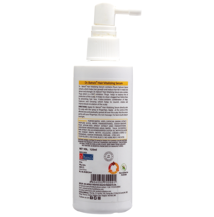 Dr Batra's Combo Pack of Hair Vitalizing Serum 125ml and Pro+ Intense Volume Shampoo 500ml Dr Batra's Combo Pack of Hair Vitalizing Serum and Pro+ Intense Volume Shampoo Dr Batra's Pro+ Intense Volume Shampoo made with natural extracts, is one of the best shampoos to increase hair volume. Strengthened with Thuja occidentalis (white cedar), it helps inhibit DHT thus reducing the risk of hair fall. Rich in antioxidants, Amla extracts, cleanse the scalp and strengthen the roots to improve the overall hair texture. Dr Batra's Hair Vitalizing Serum is a blend of natural extracts like Thuja occidentalis which helps to inhibit DHT thus reducing the risk of hair loss. hops, rich in vitamins and amino acids help in hair growth. Ginseng, known for its rejuvenating properties, strengthens hair follicles and increases blood circulation to the scalp.