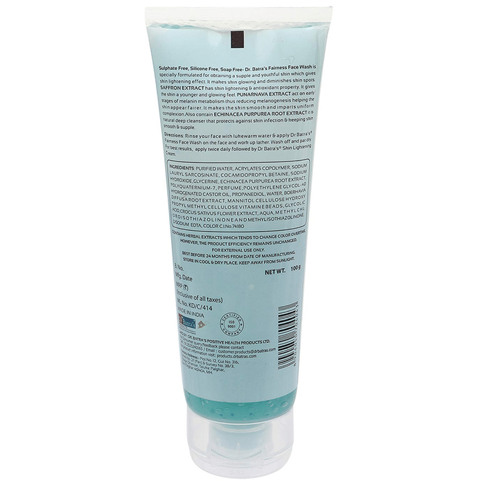 Dr Batra's Combo Pack of Moisturizing Face Wash, Instant Glow Face Wash, Face Wash Daily Care and Fairness Face Wash Dr Batra’s range of skincare products is carefully formulated with natural ingredients to cleanse, nourish and protect your skin. Dr Batra's Fairness Face Wash contains saffron extract and echinacea extract. Saffron extract is rich in antioxidants, helping the skin appear fairer. Echinacea Extract protects against skin infection keeping it smooth and supple. Dr Batra's Fairness Face Wash deep cleanses your face gently giving a fairer skin and uniforms the complexion. It helps to reduce melanin metabolism which gives a fairer skin and uniforms the complexion. The daily application keeps the skin supple by deep cleansing it at the deepest level giving it a lightning effect. Dr Batra’s Moisturizing Face Wash is infused with the goodness of aloe vera and echinacea extracts. With intense purifying and moisturising properties, this moisturising face wash helps to enhance overall skin health. Packed with antioxidants aloe vera moisturises the skin while echinacea help to fight against skin problems. Dr Batra's Instant Glow Face Wash is infused with the goodness of turmeric and echinacea extracts. These time-tested ingredients work together in synergy to moisturise and enhance overall skin health. This face wash for glowing skin helps to eliminate daily impurities and the effects of pollutants, leaving your skin feeling smooth and looking radiant. Free from harsh chemicals, this face wash is an ideal choice for glowing skin. Dr Batra's Daily Care Face Wash is enriched with a combination of echinacea extracts, tea tree oil, vitamin B3 and vitamin E. These mild ingredients work together to not just cleanse but also to protect and gently moisturise your skin. It keeps impurities away, giving you healthy-looking skin. | Key Ingredients: Saffron extract Echinacea extract Aloe vera Turmeric Tea tree oil | Key Benefits: Helps to clean dirt, deep impurities, and pollutants from the face Aloe vera moisturises the skin tissues and rejuvenate skin health for a clear, smooth and fresh face It removes uneven suntan, repairs damage and brightens the skin tone Turmeric face wash is the finest for treating dry, dull skin | Directions For Use: Use as directed on the label or as advised by your healthcare provider | Safety Information: For external use only Keep out of the reach of children Store in a cool and dry place away from direct sunlight