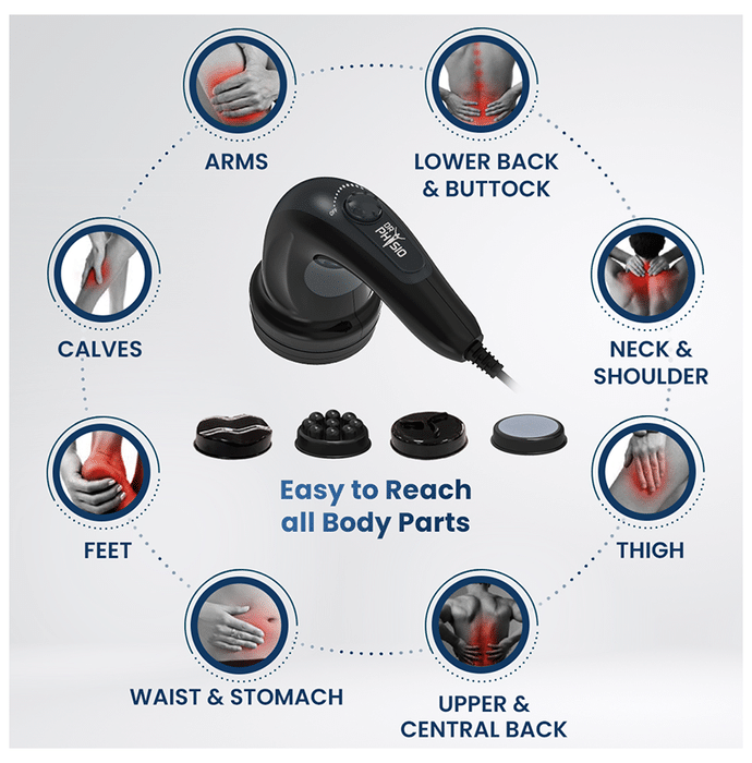 Dr Physio Electric Full Body Massager has three massaging heads for deep massages. It can be used for the neck, back and other body parts. The device helps speed up muscle recovery. It comes with wave massage, scraping, rolling heads, and a protective cover. The massager helps relieve anxiety, digestive disorders, fibromyalgia, headaches, stress-related insomnia, myofascial pain syndrome, soft tissue strains or injuries and sports injuries | Uses: The device is designed to apply steady pressure on different body parts. It utilises the shiatsu massage technique to create a sense of relaxation | Product Specifications and Features: | 4 massage heads: The different massage heads can be used to customise massage experience to relieve pain | Targeted full body massage: The ergonomic handle enables vigorous deep tissue targeted massage on the neck, back, shoulders, legs, buttocks, toes, etc. | Lightweight and portable: The small size of the massager makes it easy to carry around | Ergonomic handle: Enables massaging hard-to-reach areas and for comfortable grip | Strong motor: The lightweight motor provides vibrations that soothe pain and stress | Proactive fabric coverage: Can be removed and cleaned for maintaining hygiene | Shiatsu massage: The massager uses shiatsu massage techniques to serve various needs of the user | Contents: Massager, 4 Massage heads, User manual | Directions for Use: Refer to the user manual for detailed instructions of use | Safety Information: Do not use the massager while it is charging Do not overcharge the massager, remove the charging cable from the unit when charging has been completed Never submerge the massager in the water Do not attempt to repair the massager Only use the provided charging cable and adapter with the unit Avoid direct sun exposure | Note: Customer Care Id: [email protected] Customer Care Number: +91-7527013265 / +91-9356658436