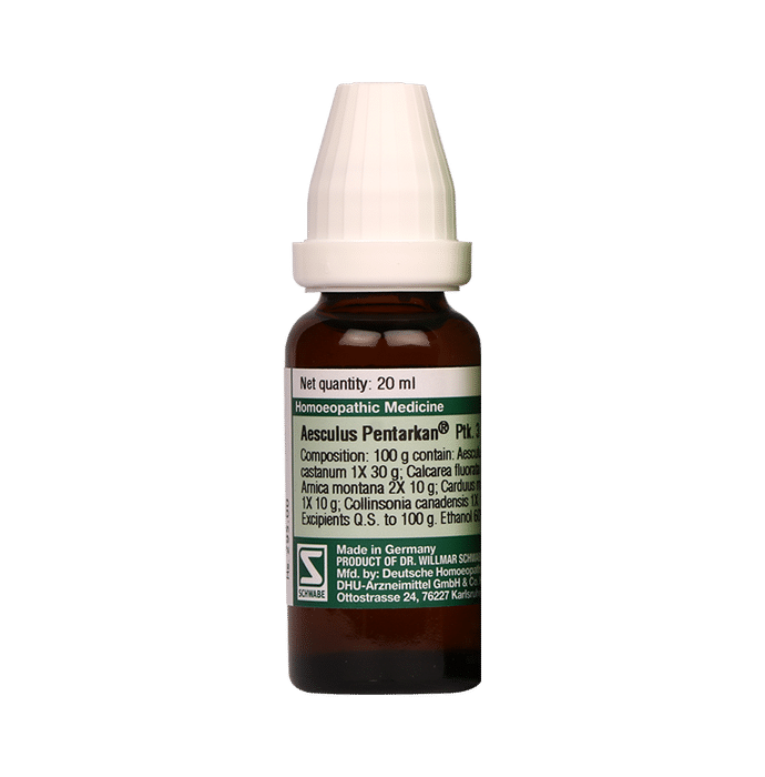 Dr Willmar Schwabe Germany Aesculus Pentarkan Ptk. 3 Drop Aesculus Pentarkan is a medicine combination used in the management of piles. Hemorrhoids as well as their complications can be treated by this remedy with significant results. It also improves symptoms like pain, flatulence, constipation and enhances general digestive function. | Key Ingredients: Aesculus 1X 30 g Calcium fluoratum 6X 10 g Arnica 2X 10 g Carduus marianus 1X 10 g Collinsonia canadensis 1X 10 g | Key Benefits: Can help with all types of piles Can prove beneficial in relieving pain due to haemorrhoids and constipation Can prove beneficial in digestion | Directions For Use: Unless otherwise prescribed by the physician For acute complaints, 10-20 drops should be taken at hourly intervals until improvement occurs, up to a maximum of 12 times a day For subsequent treatment, 10-20 drops should be taken 3 times a day | Safety Information: Read the label carefully before use Store in a cool and dry place away from direct sunlight Keep out of reach of children