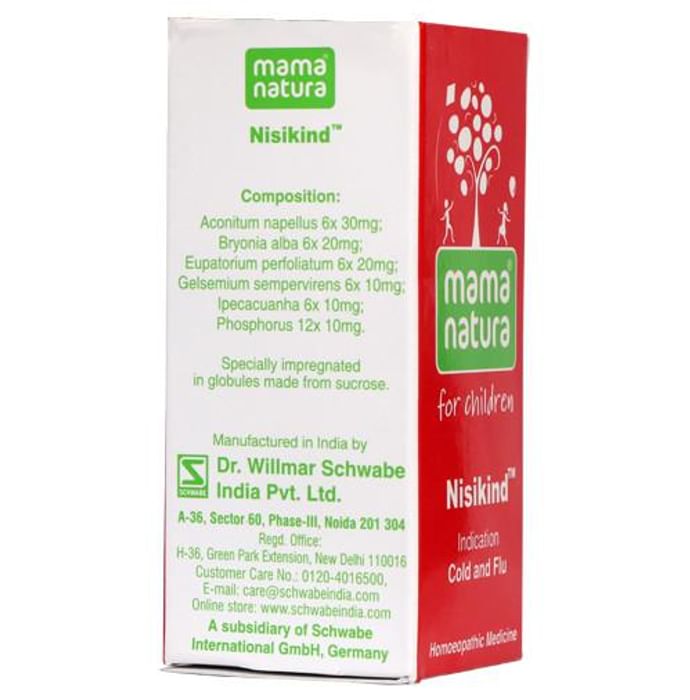 Dr Willmar Schwabe India Nisikind Globules NISIKIND DESCRIPTION Effectively controls common repiratory problems in children and is indicated for cold associated with cough, shortness of breath, hoarseness, muscle pain & fever • Effectively controls dry hacking cough and soreness in the chest • Relieves hoarseness and dryness of throat • Controls body ache, headache and associated mild fever • Allays physical and mental restlessness. Presentation: Bottle of 10g of globules. Dosage: Unless otherwise prescribed by the physician, it can be given for prevention 3 globules 3 times a day and on appearance of first symptoms (shivering, fever and muscular pain) 5 globules every 2 hours. After improvement and until the symptoms disappear, 5 globules every 3 hours (preferably to be administered 15 minutes before meals). If complaints are not relieved, consult a specialist. Side-effects: No side effects of Nisikind are known. Contra-indications: No contra-indications for the use of Nisikind are known. Interactions: No interactions between Nisikind and other products are known. Use under medical supervision.