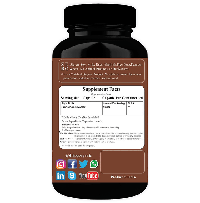 Dr. JPG Organic Cinnamon Anti Ageing Vegetarian Capsule Dr. JPG Organic Cinnamon Anti Ageing Vegetarian Capsule is a natural, organic product and is grown without synthetic pesticides, fertilisers, and preservatives. Further, it is processed at USDA Organic, India Organic and ISO Certified facilities and is chemical-free.