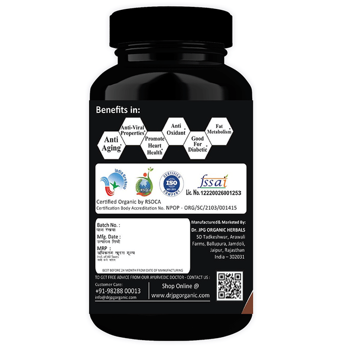 Dr. JPG Organic Cinnamon Anti Ageing Vegetarian Capsule is a natural, organic product and is grown without synthetic pesticides, fertilisers, and preservatives. Further, it is processed at USDA Organic, India Organic and ISO Certified facilities and is chemical-free. | Key ingredients Organic cinnamon powder | Key Benefits: Cinnamon is rich with antioxidants and can help in managing both bacterial and fungal infection It contains anti-inflammatory properties and can help manage heart disease, blood sugar levels, and blood pressure, and supports gut health It is certified as per Indian and US organic standards, is grown without synthetic pesticides and is not tested on animals It does not contain preservatives, food additives, food colour and insecticides It is certified by RSOCA, USDA organic, ISO certified, food-grade packaging, India organic, Jaivak Bharat, GMP certified, FSSAI | Directions For Use: Take one capsule twice a day after a meal with water or as directed by the healthcare practitioner | Safety Information: Read the label carefully before use Store in a cool and dry place, away from sunlight Keep out of reach of children Use under medical supervision Don’t exceed the recommended dosage In case there is discomfort or leakage, please remove the cap and insert it again correctly In case you experience rash or irritation, discontinue use and consult a doctor This product is not intended to diagnose, treat, cure or prevent any diseases