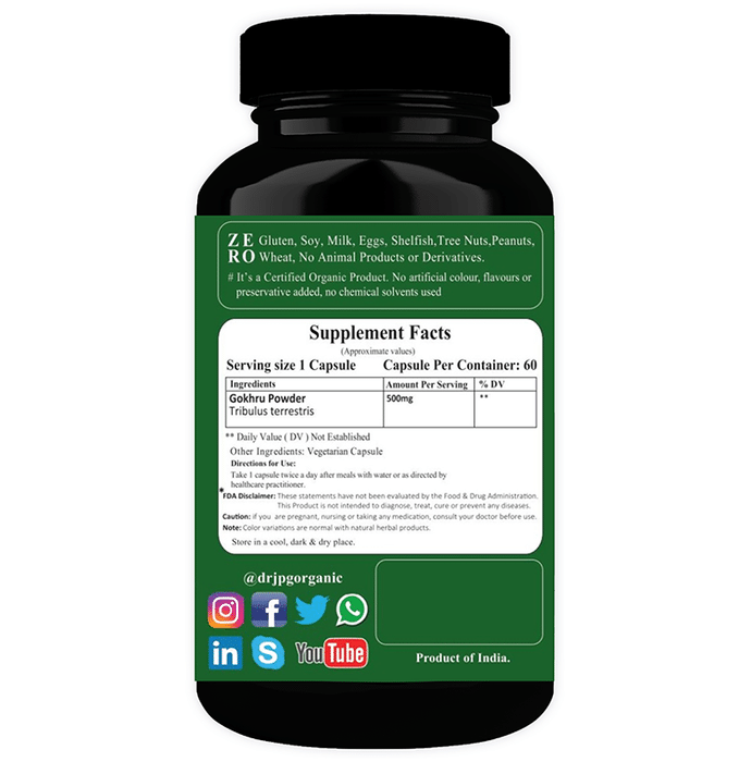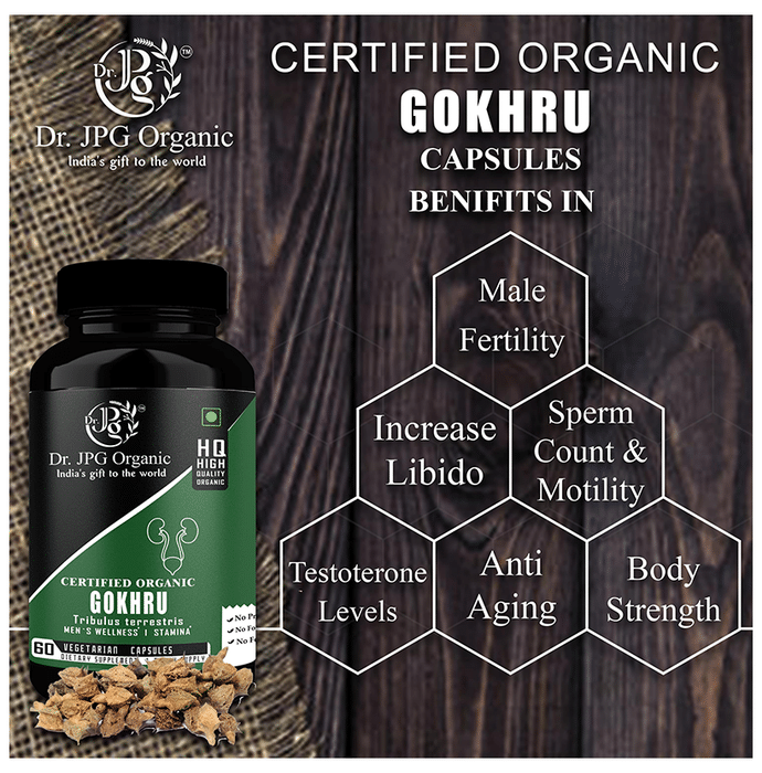 Dr. JPG Organic Gokhru Vegetarian Capsule is a dietary supplement that meets international standards and reduces health risks. It is eco-friendly and can prevent water contamination from harmful chemicals and heavy metals as there are no chemical pollutants in organic farming. | Key Ingredients: Gokhru powder | Key Benefits: Each capsule contains 500 mg of gokhru powder It may help in strengthening the urinary system organs like kidneys, urinary bladder, and gallbladder Gokhru powder can help in managing testosterone levels and libido in the body It can help in managing male infertility, sperm motility and stimulating sperm production It may support the healthy flow of urine and soothe the membranes of the urinary tract The powder can help to regulate the level of serotonin levels and boost brain function It might help in preventing the formation of kidney stones and removing the kidney stones by dissolving the current ones due to its diuretic properties It may improve muscle growth, body strength, manage high blood pressure and cholesterol It does not contain gluten, soy, milk, egg, shellfish, tree nuts, peanuts, wheat, animal products, or derivatives and is not tested on animals It is certified as per Indian and US organic standards, not tested on animals, and is grown without synthetic pesticides It does not contain pesticides, preservatives, food additives, food colour, insecticides It is certified by RSOCA, USDA organic, ISO certified, food-grade packaging, India organic, Jaivak Bharat, GMP certified, FSSAI | Directions For Use: Take one capsule twice a day after a meal with water or as directed by a healthcare practitioner | Safety Information: Read the label carefully before use Store in a cool and dry place, away from sunlight Keep out of reach of children Use under medical supervision Don’t exceed the recommended dosage In case there is discomfort or leakage, please remove the cap and insert it again correctly In case you experience rash or irritation, discontinue use and consult a doctor This product is not intended to diagnose, treat, cure or prevent any diseases