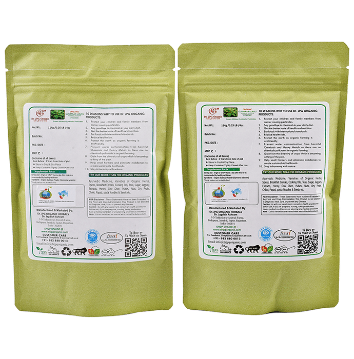 Dr. JPG Organic Gudmaar Leaves Powder (114gm Each) Dr. JPG Organic Gudmaar Leaves Powder (114gm Each) is a pure and natural dietary supplement which is grown without synthetic pesticides, fertilisers, and preservatives. Further, it is processed at USDA Organic, India Organic and ISO-certified facilities and is chemical-free.