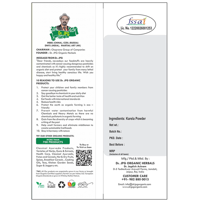 Dr. JPG Organic Karela Powder (100gm) Dr. JPG Organic Karela Powder (100gm) is a natural, organic product and is grown without synthetic pesticides, fertilisers, and preservatives. Further, it is processed at USDA Organic, India Organic and ISO-certified facilities and is chemical-free.