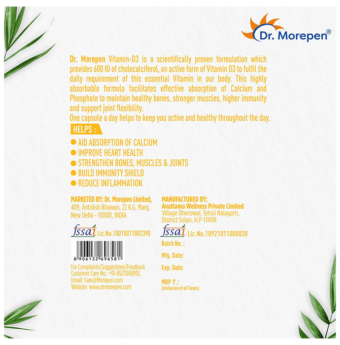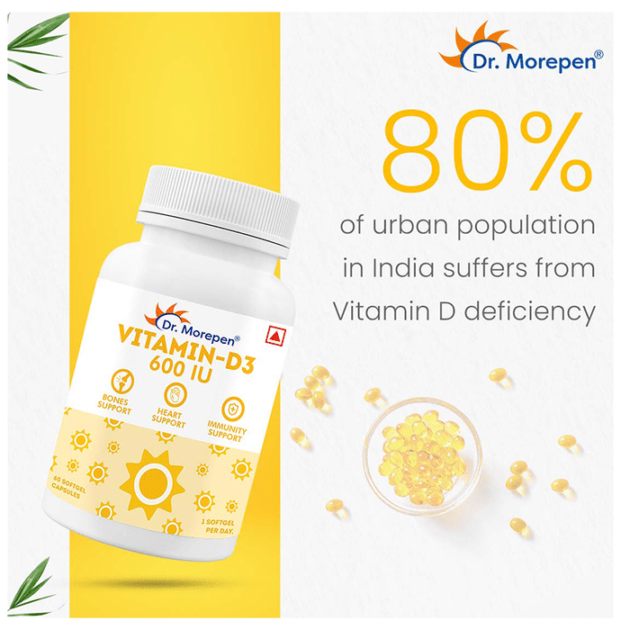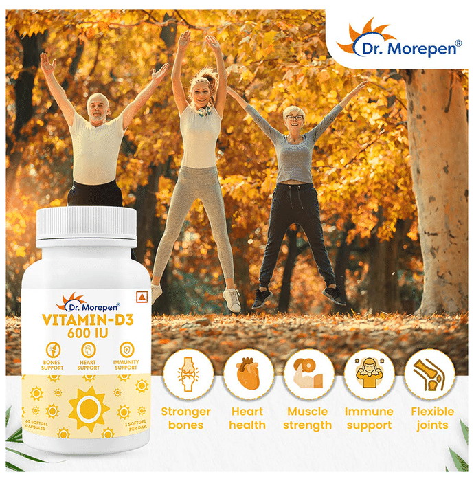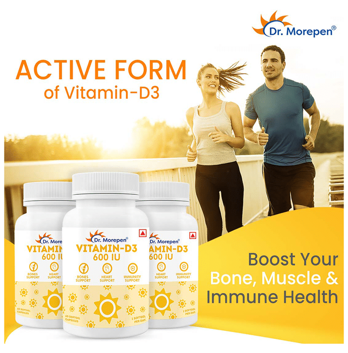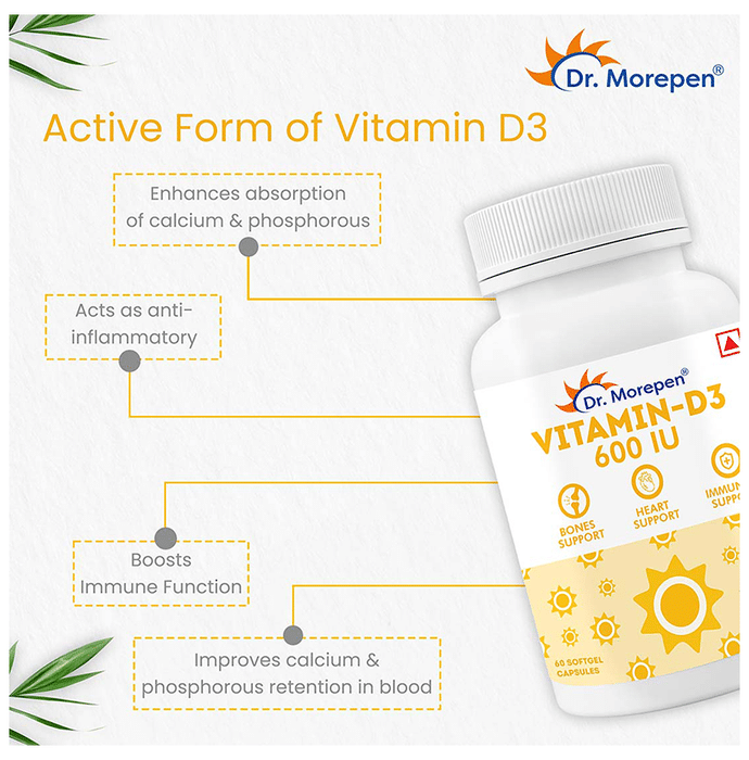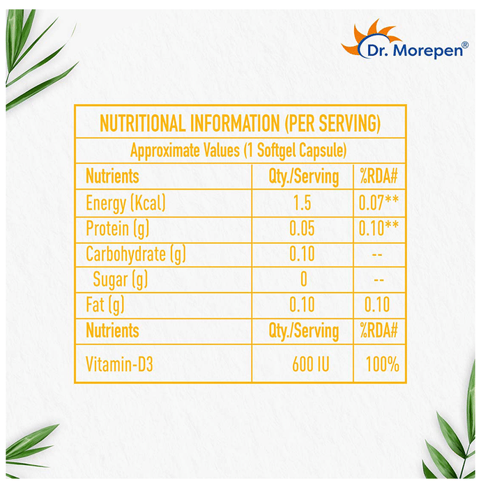 Dr. Morepen Vitamin-D3 600 IU Softgel Capsule It is an essential nutrient for maintaining healthy bones and teeth, promoting neuromuscular and immune health, regulating blood pressure, protecting the heart, and supporting insulin secretion. Vitamin D is required for calcium absorption from foods. It helps make up for its deficiency and promote healthy bones by regulating the calcium and phosphorus level in the blood. | Key Ingredients: Vitamin D3 | Key Benefits: Enhances skeletal muscle strength and physical performance Improves muscle and bone strength through calcium absorption Vitamin D is beneficial for brain development and functioning It boosts blood calcium levels and the maintenance of bones, muscle function and the normal function of the immune system | Directions For Use: Use as directed on the label or as advised by your healthcare provider. | Safety Information: Read the label carefully before use Store in a cool and dry place away from direct sunlight Keep out of reach of children