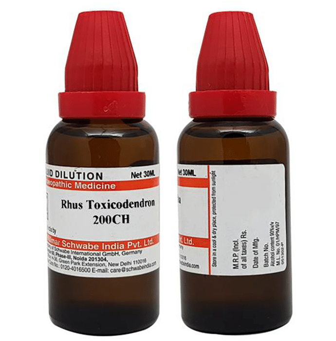 Dr. Reckeweg Rhus Tox Dilution 200 CH Dr Reckeweg Rhus Toxicodendron Dilution is a health tonic used for treating several health complications, including itchy skin with rashes, conditions related to herpes, eczema and is highly effective in the treatment of rheumatic pains. It is also helpful in relieving conditions of nausea, vomiting and high body temperature. Based on the homoeopathic formulation, it is safe to use and has no side effects.