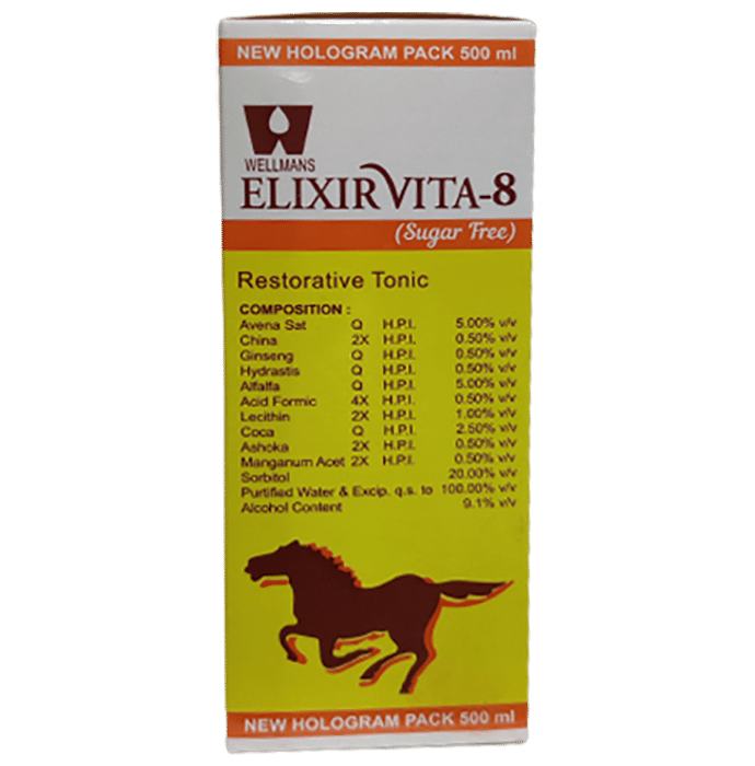 Dr. Wellmans Elixirvita 8 Restorative Tonic is an ideally suited preparation for the stimulation and regeneration of both physical and mental processes of the body and is a restorative tonic for the whole family. It is a balanced combination of homoeopathic medicines with remedial and beneficial effects. | Key Ingredients: Avena sativa Q China 2x Ginseng Q Hydrastis Q Alfalfa Q Acid formic 4x Lecithin 2x Coca Q Ashoka 2x Manganum acet 2x Excip q.s. | Key Benefits: A restorative tonic recommended in convalescence, lack of appetite, condition of fatigue and impaired digestion Elixirvita 8 is useful in debility effects of illness, convalescence, loss of vital fluids and malnutrition Helps in nervous erethism, insomnia and promotes a feeling of well being Elixirvita is sugar-free and beneficial for diabetics and health-conscious people | Directions For Use: Adults: one tablespoon full or as directed by the physician Children: one tablespoon full, half an hour after meals thrice daily, or as directed by the physician | Safety Information: Read the label carefully before use Keep out of reach of the children Store in a cool dry place