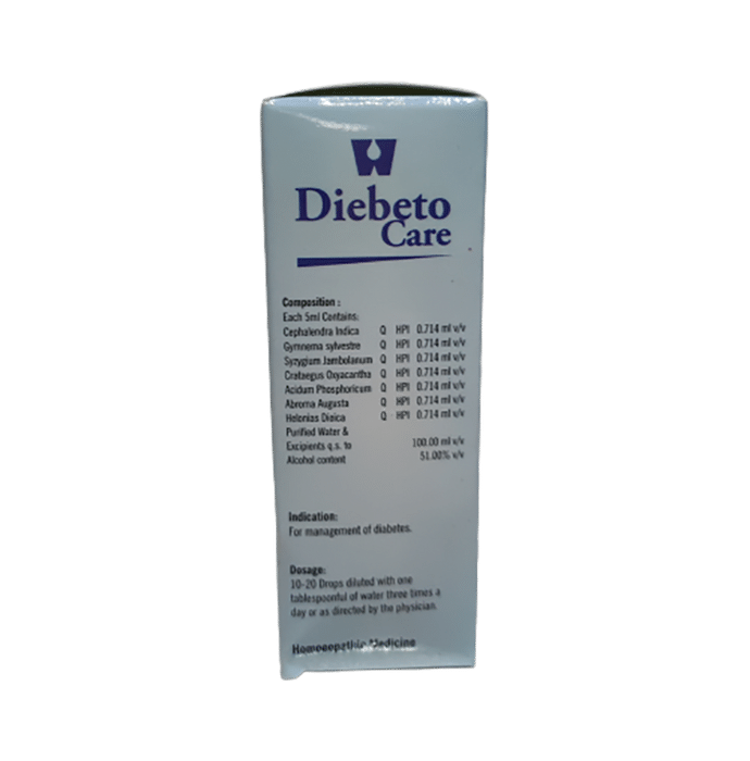 Wellmans WHL Diebeto Care Drop is a unique homoeopathic formulation and an effective treatment for controlling and maintaining blood glucose levels. It also helps manage associated symptoms such as depression and nervousness. | Key Ingredients: Cephalandra Indica Gymnema Sylvestre Syzygium Jamb Crataegus Oxy Acidum phos Abroma Aug Helonias Dioica | Key Benefits: Effective treatment for controlling and maintaining blood glucose levels It also helps manage associated symptoms such as depression and nervousness | Directions For Use: 10-20 drops diluted with one tablespoon 3 times daily or as directed by the physician. | Safety Information: Read the label carefully before use Store in a cool and dry place away from direct sunlight Keep out of reach of the children