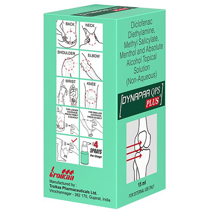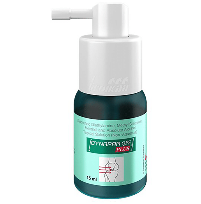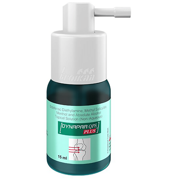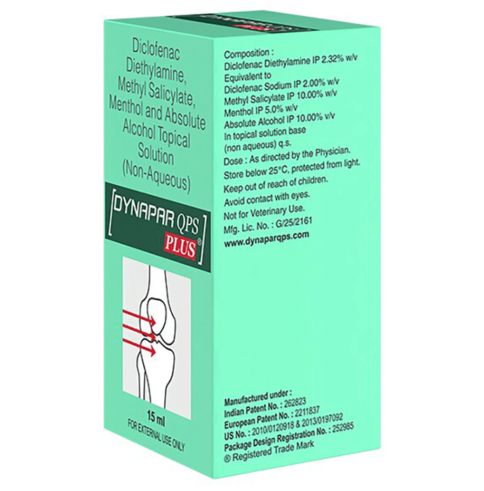 Dynapar Qps Plus Topical Solution contains a non-steroidal anti-inflammatory drug to treat mild to moderate pain and inflammation, particularly musculoskeletal pain. It is used for the management of chronic pain caused by osteoarthritis, rheumatoid arthritis, low back pain, and frozen shoulder. | Key Ingredients: Diclofenac, Methyl Salicylate, Alcohol and Menthol | Key Benefits: Dynapar QPS Plus contains Diclofenac which reduces inflammation while Methyl Salicylate and Menthol penetrate deep into the affected area and act as mild analgesics Dynapar QPS Plus is indicated for relief from pain, swelling and inflammation due to arthritis Dynapar QPS Plus provides superior pain relief after topical application by enhancing the penetration of diclofenac through the skin Dynapar QPS Plus goes deep to the site of pain in the joints and muscles so it provides quick and effective relief from pain | Good to Know: Formulated with Diclofenac, Methyl Salicylate, Alcohol and Menthol | Concerns It Can Help With: Lower back pain, neck pain and shoulder pain, pain due to sports injury, osteoarthritis and skin inflammation | Product Form: Solution | Dosage: Dynapar QPS Plus can be applied to the site of local pain 3-4 times a day. | Directions For Use: Use as directed by the physician. | Safety Information: Read the label carefully before use Do not exceed the recommended dosage Store in a cool and dry place Keep it away from the reach of children