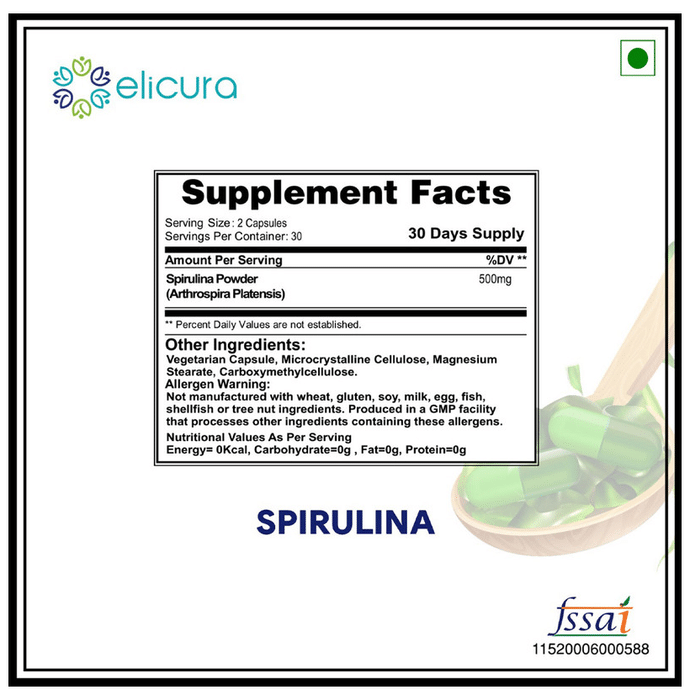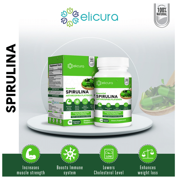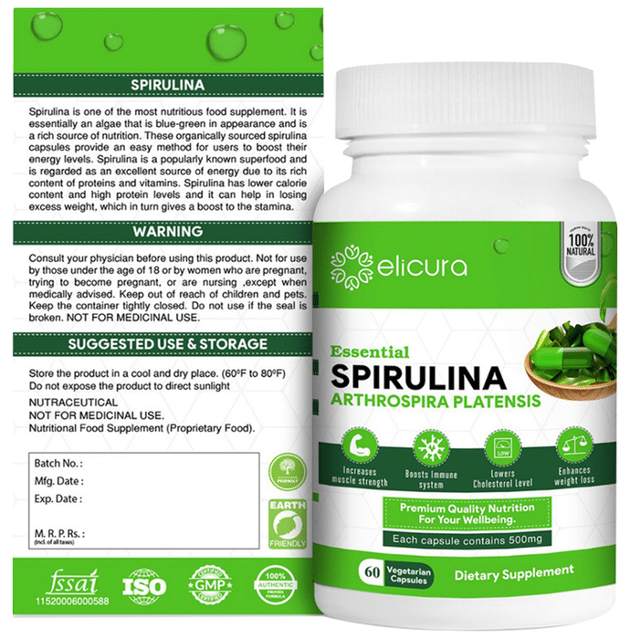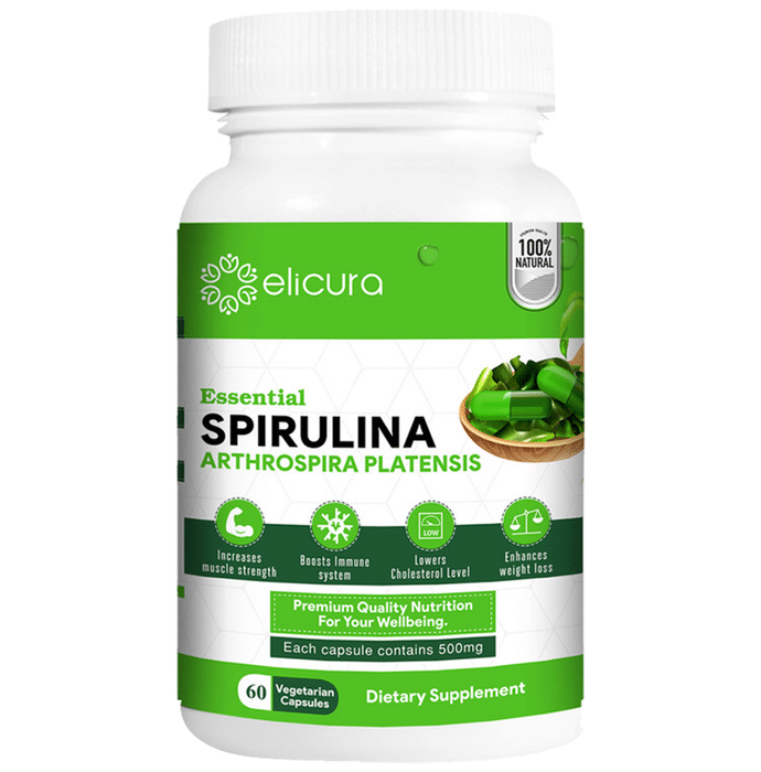 Key Ingredients of Elicura Essential Spirulina Vegetarian Capsule: Spirulina powder | Key Benefits of Elicura Essential Spirulina Vegetarian Capsule: Arthrospira Platensis, the main ingredient, is high in nutrition and provides energy for daily activities For carbohydrate production, energy storage and provision High in protein and lowers calorie content Helps you lose excess weight by boosting stamina