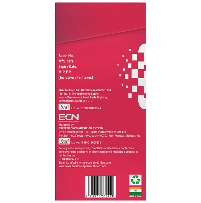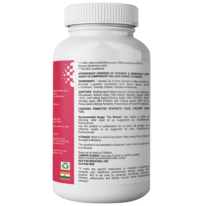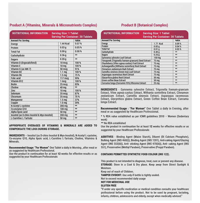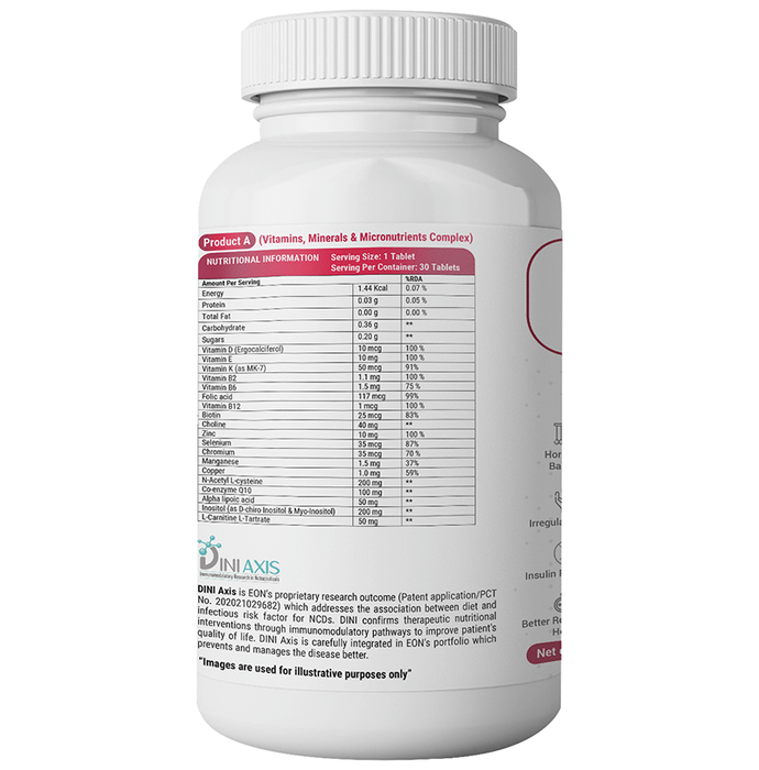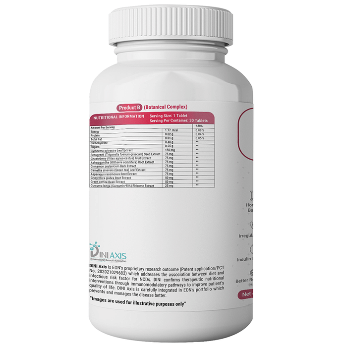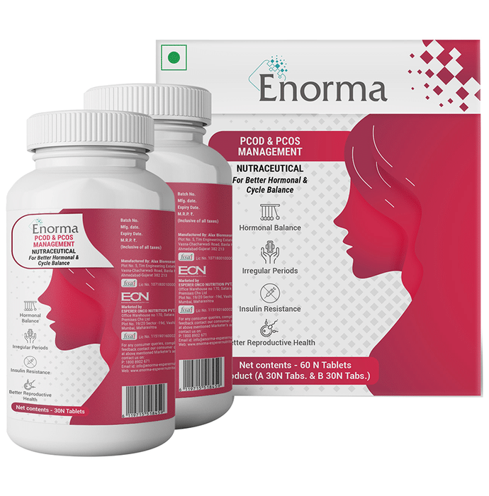Enorma PCOD & PCOS Management Nutraceutical Tablet is the combination of Vitamin D, Vitamin E, Vitamin B (B2, B6, B12 and Folic acid). It contains botanicals like Agnus-castus Extract, Green Tea Extract, etc and Minerals like Zinc and Manganese which to helps to maintain hormonal balance. | Key Ingredients: Product A Gymnema sylvestre Extract (50 % Gymnemic acid) 150mg Fenugreek Extract 75mg Vitex agnus-castus Extract 75mg Ashwagandha (5% withanolides) 75mg Cinnamon bark Extract 75mg Green tea Extract 75mg Asparagus racemosus Extract 75mg Glycyrrhiza glabra Extract 50mg Green coffee bean Extract 50mg Curcumin 95% 25mg | Product B Vitamin D (Ergocalciferol) 10mcg Vitamin E (Tocopheryl Acetate) 10mg Vitamin K (as Phytonadione & Menaquinone-7) 50mcg Vitamin B2 (Riboflavin) 1.1mg Vitamin B6 1.5mg Folic acid 117mcg Vitamin B12 1mcg Biotin 25mcg Choline 40mg Zinc 10mg Selenium 35mcg Chromium 35mcg Manganese 1.5mg Copper 1.0mg N-Acetyl L-cysteine 150mg Co-enzyme Q10 100mg Alpha-lipoic acid 50mg L-Glutathione 50mg Inositol 200mg L-Carnitine L-Tartrate 50mg | Key Benefits: Best suited for reproductive health- Contains Cinnamon bark Extract, Asparagus racemosus Extract and Inositol for regulation of menstruation and its associated problems Reduces blood glucose level- It has Fenugreek Extract, Gymnema Sylvestre Extract and Curcumin, which synergistically helps to reduce blood glucose levels and improves insulin sensitivity | Directions For Use: For Women- 1 Capsule (Tablet A – Post lunch and Tablet B - After Dinner) once a day, after a meal or as suggested by a healthcare professional. | Safety Information: Read the label carefully before use Keep out of reach of the children Store in a cool dry place Not to exceed the recommended daily usage Not for medicinal use The product is not for parenteral use Product is not to be used by pregnant, nursing and lactating women or by infants, children, adolescents and elderly, except when medically advised In case of accidental overdose, contact a physician