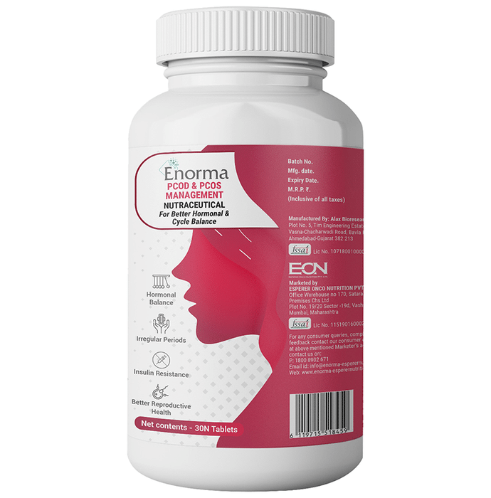 Enorma PCOD & PCOS Management Nutraceutical Tablet (30 Each) Enorma PCOD & PCOS Management Nutraceutical Tablet is the combination of Vitamin D, Vitamin E, Vitamin B (B2, B6, B12 and Folic acid). It contains botanicals like Agnus-castus Extract, Green Tea Extract, etc and Minerals like Zinc and Manganese which to helps to maintain hormonal balance.