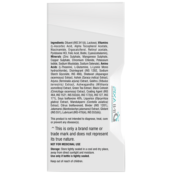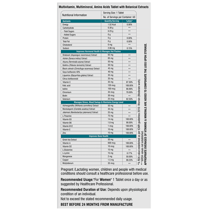 Shatavari (Aparagu Racemou) Extract 65mg | Soy ioflavone 40mg | Jatamai (Nardotachy jatamani) 25mg | Black cohoh (Cimicifuga racemoa) 45mg | Caltrop (Tribulu terretri) 50mg | Ahwagandha (Withania omnifera) Extract 50mg | Green tea extract 50mg | Biotin 30mcg | Citru bioflavonoid 35mg | Vitamin A 600mcg | Vitamin D 400IU | L-Glutamic acid 15mg | Zinc 10mg | Copper 1.5mg | Ahok (Saraca indica) Extract 65mg | Liquorice (Glycyrrhiza glabra) Extract 35mg | Vitamin E 10mg | Folic acid 180mcg | Iodine 100mcg | Selenium 25mcg | Indian pennywort (Centella aiatica Extract 35mg) | Chromium 35mcg | Vitamin B3 15mg | Arjuna (Terminalia arjuna) 50mg | Manganee 2mg, L-Lyine 15mg | Molybdenum 35mcg | Vitamin B6 1.8mg | Vitamin B12 1mcg | Vitamin C 35mg Key Benefit: