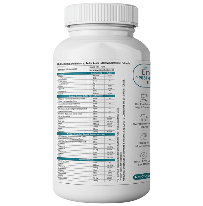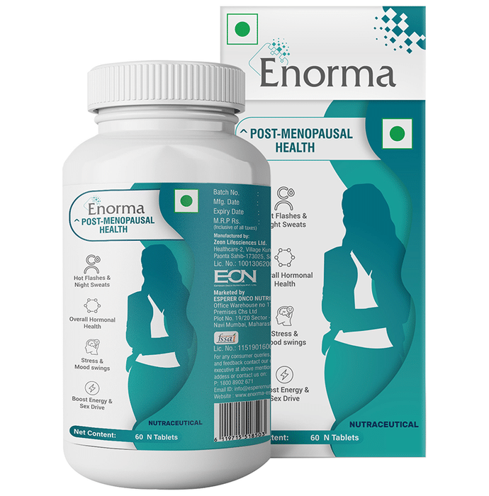 Enorma | Post-Menopausal Health Nutraceutical Tablet formulated with vitamin A, vitamin D, vitamin E, vitamin B3, L-Glutamic Acid, zinc and copper. Also, contains shatavari extract, ashok extract, liquorice extract, jatamasi, black Cohosh, soya isoflavone extracts. The tablet helps to prevent hot flushes, stress and helps in managing mood swings. DINI Axis (Diet-Infection-Nutrition-Immunity) is a research outcome that signifies the interaction metrics between Diet and Infection risk factors related to Non-Communicable Diseases (NCDs). DINI confirms Therapeutic Nutritional Interventions through modifying immunomodulatory pathways to improve patient’s overall quality of life. It comprises the highest quality ingredients and is safe to consume when used as per the stated label. | Key Ingredients: Shatavari (Asparagus Racemosus) Extract 65mg Soy isoflavones 40mg Jatamasi (Nardostachys jatamansi) 25mg Black cohosh (Cimicifuga racemosa) 45mg Caltrops (Tribulus terrestris) 50mg Ashwagandha (Withania somnifera) Extract 50mg Green tea extract 50mg Biotin 30mcg Citrus bioflavonoids 35mg Vitamin A 600mcg Vitamin D 400IU L-Glutamic acid 15mg Zinc 10mg Copper 1.5mg Ashok (Saraca indica) Extract 65mg Liquorice (Glycyrrhiza glabra) Extract 35mg Vitamin E 10mg Folic acid 180mcg Iodine 100mcg Selenium 25mcg Indian pennywort (Centella asiatica Extract 35mg) Chromium 35mcg Vitamin B3 15mg Arjuna (Terminalia arjuna) 50mg Manganese 2mg, L-Lysine 15mg Molybdenum 35mcg Vitamin B6 1.8mg Vitamin B12 1mcg Vitamin C 35mg | Key Benefits: Soy Isoflavones helps manage mood swings Caltrops, ashwagandha extract along with soy Isoflavones help to reduce fatigue and manage anxiety Vitamin B3 helps to manage disrupted sleep and headaches Biotin helps to strengthen hair, skin and nails Green Tea extract helps to control weight gain and osteoporosis is prevented by citrus bioflavonoids, vitamin A, D, L-Glutamic acid, zinc and copper | Directions For Use: For adults 1 capsule once a day, after a meal or as suggested by healthcare professionals. | Safety Information: Read the label carefully before use Keep out of reach of the children Store in a cool dry place Not to exceed the recommended daily usage Not for medicinal use The product is not for parenteral use Product is not to be used by pregnant, nursing and lactating women or by infants, children, adolescents and elderly, except when medically advised In case of accidental overdose, contact a physician {"mode":"full","isActive":false}