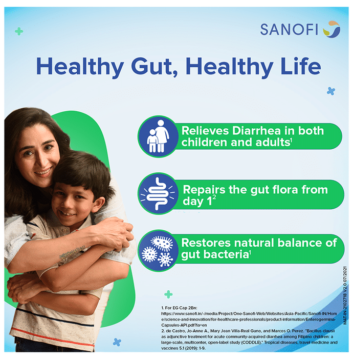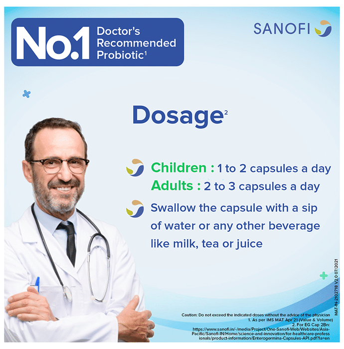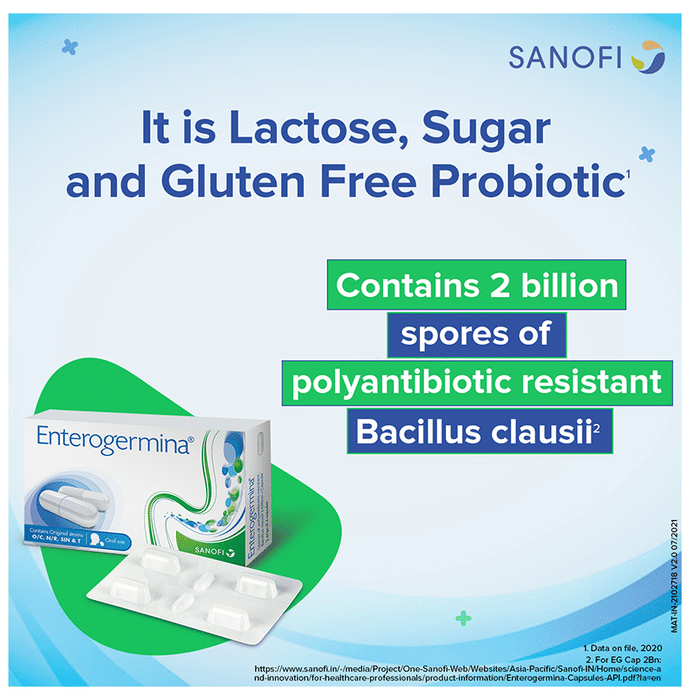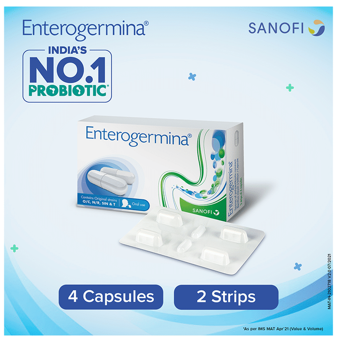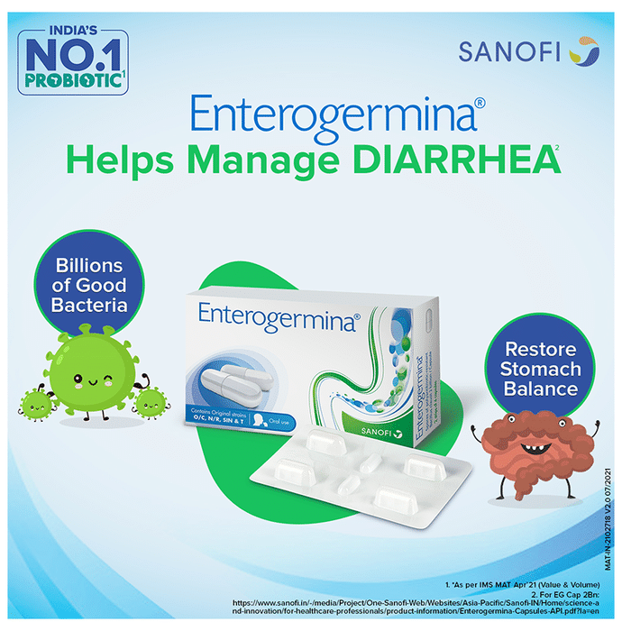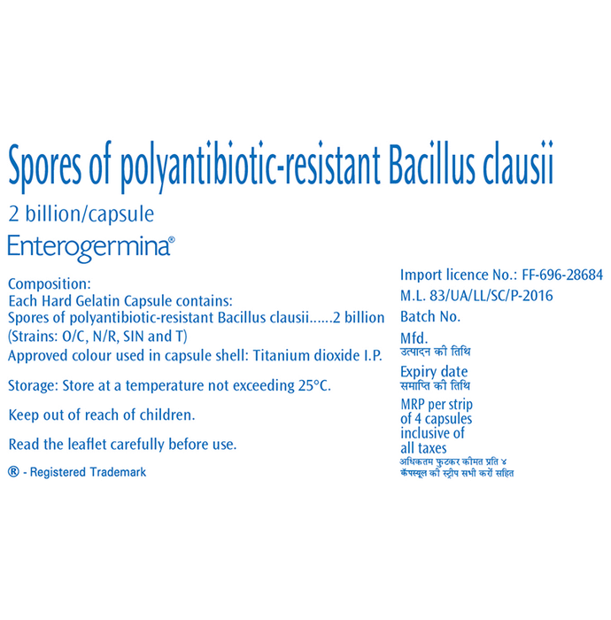 Enterogermina Probiotic Capsule Supplement for Diarrhea Treatment & Restoration of Gut Flora, for Kids & Adults Capsule It is a dietary supplement formulated with bacillus clausii to support your immune and digestive health. Bacillus clausii is a spore-forming bacterium that inhibits the growth of pathogens in the gastrointestinal tract. It helps in restoring the balance of intestinal bacterial flora. | Key Ingredients: 2 Billion spores of polyantibiotic-resistant Bacillus clausii | Key Benefits: It is a dietary supplement formulated with bacillus clausii to support your immune and digestive health Bacillus clausii inhibits the growth of pathogens in the gastrointestinal tract It helps restore the natural balance of good and bad bacteria in the gut and promotes its healthier functioning It helps improve the symptoms of irritable bowel syndrome, flatulence and diarrhoea | Good to Know: Lactose, sugar and gluten-free | Effects of Deficiency: | Lack of probiotics can cause: Sluggish digestion and irregularity Irritable bowel syndrome Constipation Diarrhoea Heartburn Bloating | Product Form: Capsule | Directions for Use: Children: 1-2 Capsules a day or as prescribed by your medical practitioner Adults: 2-3 Capsules a day or as prescribed by your medical practitioner | Safety Information: Read the product label carefully before use Store in a cool and dry place away from direct sunlight Keep out of reach of children Consult a doctor before taking any supplement Do not exceed the recommended dosage Pregnant or nursing mothers, children, and people with medical conditions must consult a physician before taking this supplement | Quick Tips: Once open, consume the medicine within a short period to avoid contamination | Frequently Asked Questions: | Q. How do Enterogermina Capsules help? Enterogermina Capsules inhibit the growth of pathogens in the gastrointestinal tract and help restore intestinal bacterial flora balance. | Q. Is it safe to take Enterogermina Capsules with antibiotics? Enterogermina Capsules can be taken with antibiotics if prescribed by the doctor. However, you are advised to take Enterogermina Capsule 4's between one dose of the antibiotic and the next.