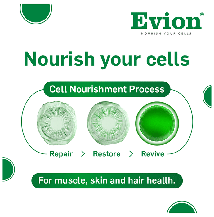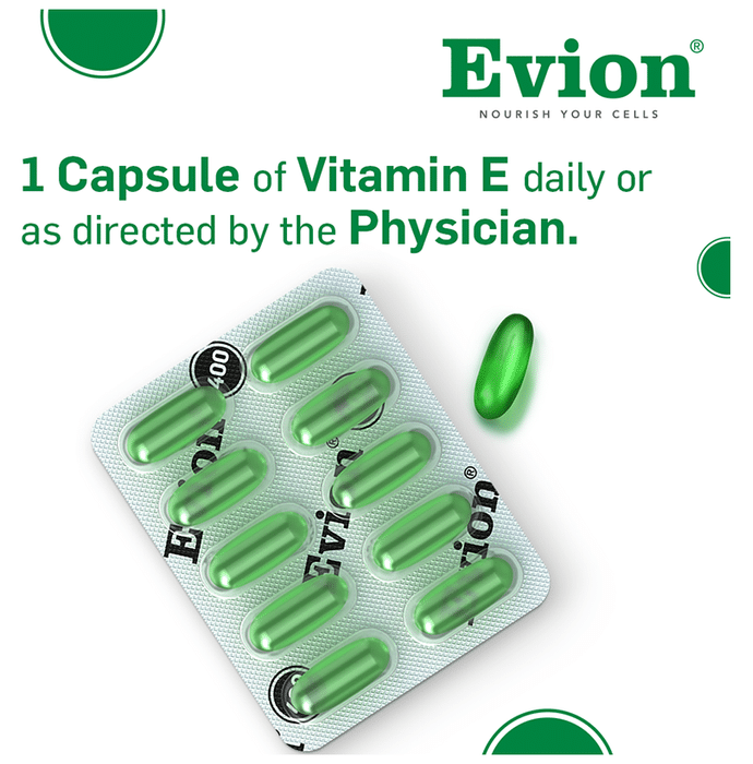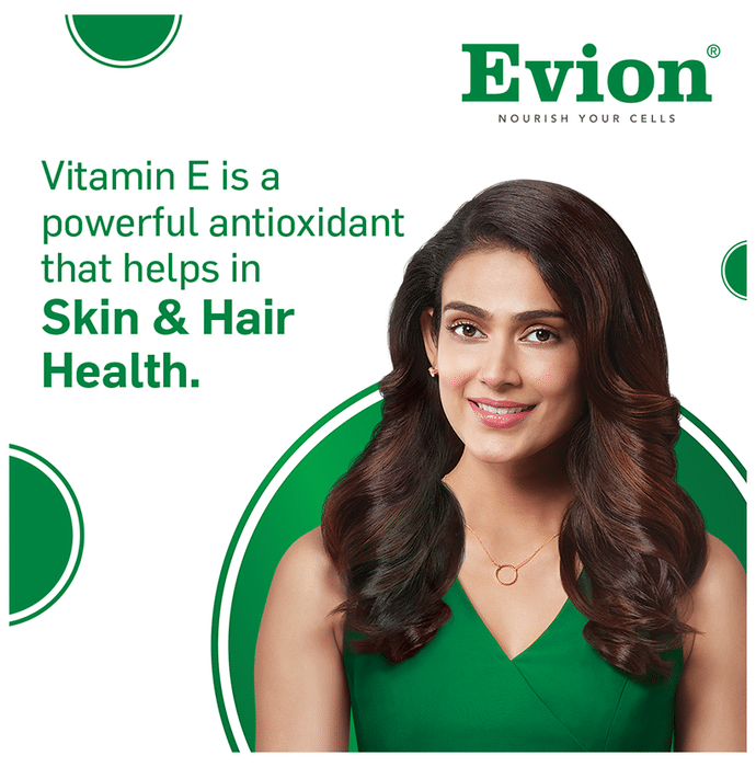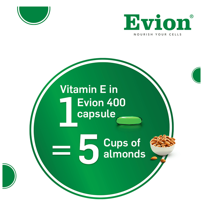 Evion 400mg Capsule is a vitamin E supplement with antioxidant and anti-inflammatory properties. It helps strengthen the body’s natural defence against illnesses. | Key Ingredients: Vitamin E | Key Benefits: It can help deal with vision problems It can relieve leg cramps and protect the muscles from exercise damage It helps protect the skin and body against free radicals Vitamin E helps reduce oxidative stress and boost antioxidant defences It protects against cognitive decline and enhances brain function | Good to Know: Vitamin E can improve immune function | Effects of Deficiency: Lack of vitamin E can cause: Muscle weakness Vision problems Loss of body movement control | Product Form: Capsule | Directions for Use: As prescribed by your medical practitioner | Safety Information: Store at room temperature of 15 to 25 C Do not exceed the recommended dosage Keep out of reach of children | Quick Tips: Since vitamin E has neuroprotective properties, taking it in the evening or night is recommended. | Frequently Asked Questions: | Q. When should I take vitamin E? Vitamin E supplements are best absorbed with a meal. | Q. Which fruit is rich in vitamin E? Avocados have the highest vitamin E content in fruit, followed by mangoes and kiwis. Half an avocado contains up to 20% of your vitamin E requirement.