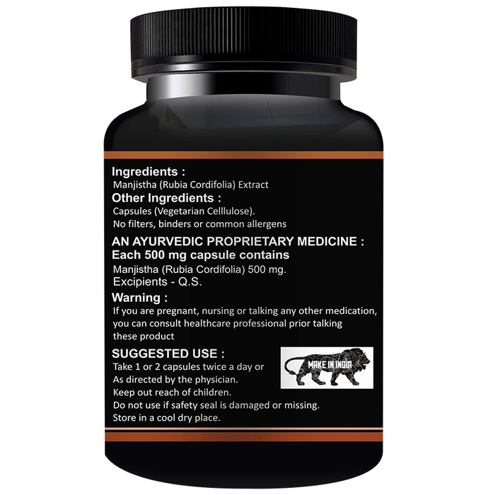 Floarkart Manjishtha Capsule is extensively used for preparing various formulations aimed at detoxifying the blood, treating skin diseases, improving skin complexion, remedying liver diseases and many more. The potent antibacterial and anti-diarrhoeal properties of Manjistha is extensively used for removing bacteria from the intestines. | Key Ingredients: Manjistha (Rubia Cordifolia) Extract Capsules (Vegetarian Cellulose) | Key Benefits: It purifies blood, which helps in skin related problems like acne, psoriasis and treats allergies It detoxifies the body, also helps with relieves menstrual pain It helps you treat gall bladder stone, calcium deficiency Manjistha also boosts wound healing and helps fight cancer | Directions For Use: Take 1 capsule twice a day with 1 glass of lukewarm water or milk, 30minutes after your meal or as directed by the physician | Safety Information: If you are pregnant, nursing or taking any other medication, you can consult a healthcare professional prior to taking this product Keep out reach of children Do not use if safety seal is damaged or missing Store in a cool and dry place