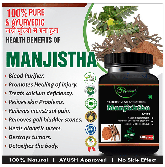 Floarkart Manjishtha 500mg Capsule Floarkart Manjishtha Capsule is extensively used for preparing various formulations aimed at detoxifying the blood, treating skin diseases, improving skin complexion, remedying liver diseases and many more. The potent antibacterial and anti-diarrhoeal properties of Manjistha is extensively used for removing bacteria from the intestines.