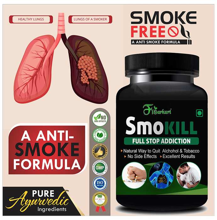 Floarkart Smokill Capsule is a pure and natural formulation that contains a mix of herbal ingredients such as Avena sativa, or common oat, which is known for its highly nutritious seeds. This ingredient is used in the treatment of anxiety, migraines, epilepsy, fatigue and has nerve-calming properties. Therefore, the capsule can be especially helpful for people who are trying to detox from alcohol and nicotine addiction. It also consists of Lobelia inflata, or Indian tobacco, that is used for the treatment of various respiratory conditions and can be beneficial for the lungs. | Key Ingredients: Avina Sativa 150 mg Lobelia inflata 100 mg Valeriana officinalis 150 mg Hypercium perforatum 100 mg Excipients Q.S. | Key Benefits: It is therapeutic for people struggling with anxiety, migraines and fatigue as it contains nerve-calming properties It is a useful solution to get rid of the addiction to nicotine, alcohol, tobacco and cigarettes These capsules are 100% natural and have no side effects Effectively helps to regain mental strength and psychological responses to avoid the urge for further use of the addictions | Directions For Use: Take 1-2 capsules two times a day, with plain water after meals or as advised by the physician. | Safety Information: Keep away from children's reach Do not use if the seal is damaged or missing Store in a cool and dry place
