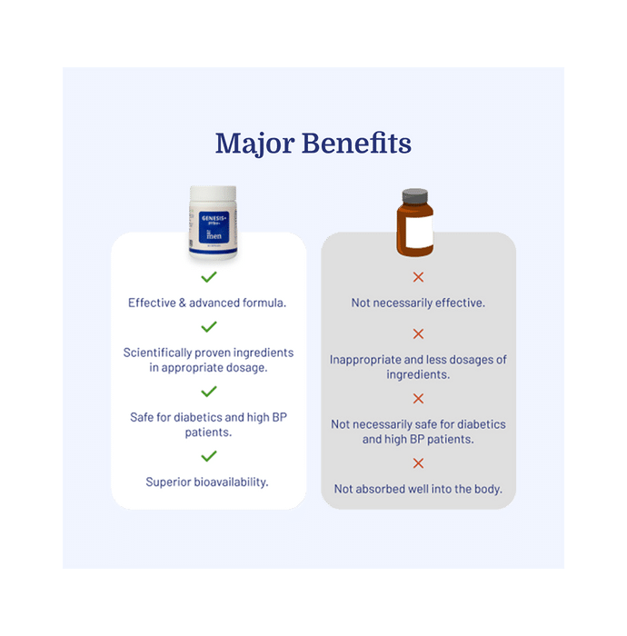 ForMen Genesis+ Capsule is the proprietary blend of enriched herbal extracts, vitamins and minerals, This formula is specifically designed to enhance sperm quality and semen volume. It is specially formulated by doctors, pharmacologists and Ayurvedic experts. | Key Ingredients: Boron Shatavari Selenium Kaunch Beej Zinc Sulphate Safed Musli | Key Benefits: Enriched with herbal extracts, vitamins and minerals Enhances sperm quality and semen volume | Directions For Use: Take two capsules once a day (one in the morning and one at night). | Safety Information: Read the label carefully before use Store in a cool and dry place away from direct sunlight Keep out of reach of the children Not recommended for pregnant women and children It is a natural product with no significant side effects Consume as per specified dosage or as recommended by a physician