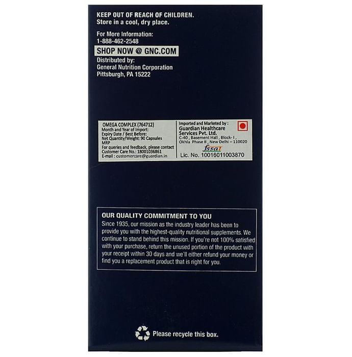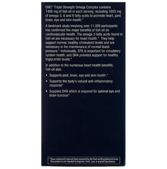 GNC Triple Strength Omega Complex Soft Gelatin Capsule contains Fish oils, ALA (Alpha-Linolenic Acid), GLA (Gamma-Linolenic Acid), and Oleic Acid as active ingredients. Key benefits of GNC Triple Strength Omega Complex Soft Gelatin Capsule: Fish oils naturally provide the heart-healthy omega-3 fatty acids EPA (Eicosapentaenoic Acid) and DHA (Docosahexaenoic Acid). The lemon flavor helps to control or reduce the fishy burps. Omega-3 fatty acids help support normal, healthy cholesterol levels and are necessary for the maintenance of normal blood pressure. Individually, EPA is important for circulatory system health. DHA provides support for healthy triglyceride levels and also, required for optimal eye and brain function. Fish oil also supports joint and skin health. Supports the body's natural anti-inflammatory response. Direction for use: As directed by the healthcare professional. Safety information: Keep out of the reach and sight of the children. Do not exceed the recommended dose. Use under medical supervision.