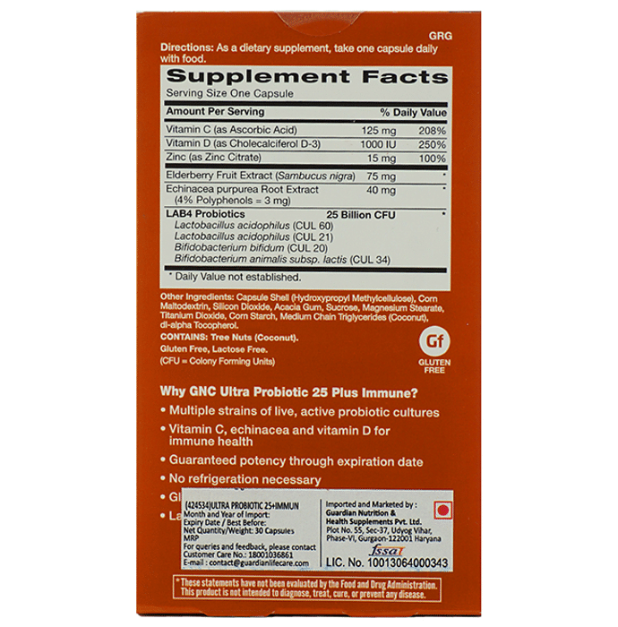 GNC Ultra Probiotic Complex Plus Immune 25 Billion CFUs Capsule is a potency guaranteed dietary supplement with probiotic support. It is a laboratory confirmed multi-strained capsule and may provide digestive support. | Key Ingredients: Bifidus complex GNC ultra acidophilus Vitamin C and D Calcium | Key Benefits: Helps in healthy digestion Maintains a better immune system Known to increase vitality | Directions For Use 1 capsule per day is to be taken for best results | Safety Information: Read the label carefully before use Keep it away from the reach of children Store in a cool and dry place Do not exceed the recommended dose No allergy concern Patients with other medication, pregnant and lactating mother should take medical advice before taking it