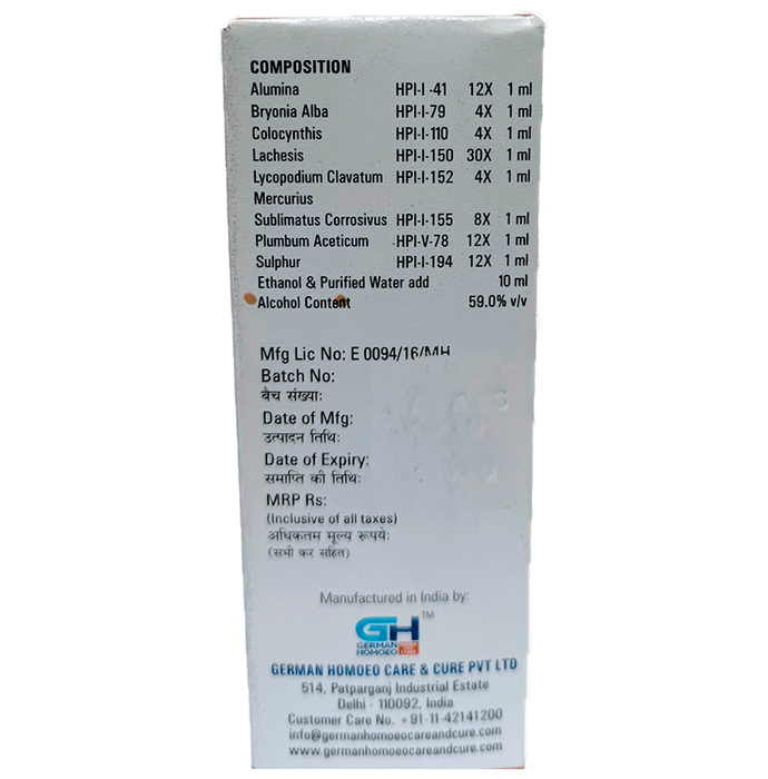Alumina | Bryonia Alba | Colocynthi | Lachei | Lycopodium Clavatum | Mercuriu | Sublimatu Corroivu | Plumbum Aceticum | Sulphur | Ethanol and Purified Water | Alcohol Content