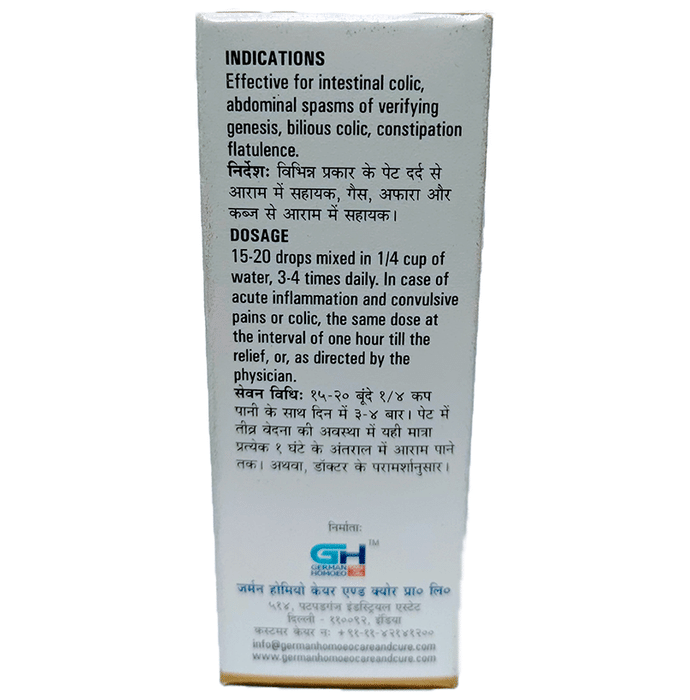 German's Stomach Ache Care and Cure Drop is a blend of powerful ingredients that are effective for intestinal colic, abdominal spasms of verifying genesis, bilious colic, constipation, flatulence. | Key Ingredients: Alumina Bryonia Alba Colocynthis Lachesis Lycopodium Clavatum Mercurius Sublimatus Corrosivus Plumbum Aceticum Sulphur Ethanol and Purified Water Alcohol Content | Key Benefits: Made with potent ingredients Effective for intestinal colic, abdominal spasms of verifying genesis, bilious colic Helps with constipation and flatulence | Directions For Use: Use as directed. | Safety Information: Read the label carefully before use Store in a cool and dry place away from direct sunlight Keep out of reach of the children