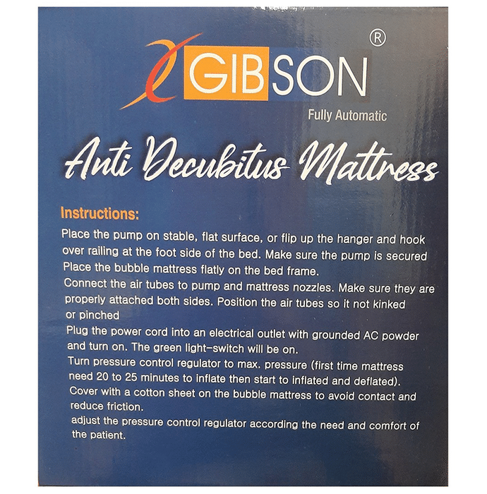Gibson Anti Decubitus Mattress is crafted with high-quality material - medical grade PVC, which is durable and breathable. Its air pump is durable and silent. Besides, it is anti-slip and leakproof. The mattress is perfect for those suffering from injuries. | Uses: It is primarily used to prevent bedsores. | Product Specifications and Features: Made with medical-grade PVC Double hose design Foldable additional parts Durable and silent air pump Perfect for those suffering from injuries Prevents bedsores | Directions For Use: Use as directed on the label. | Safety Information: Read the label carefully before use Store in a cool and dry place away from direct sunlight Keep out of reach of the children
