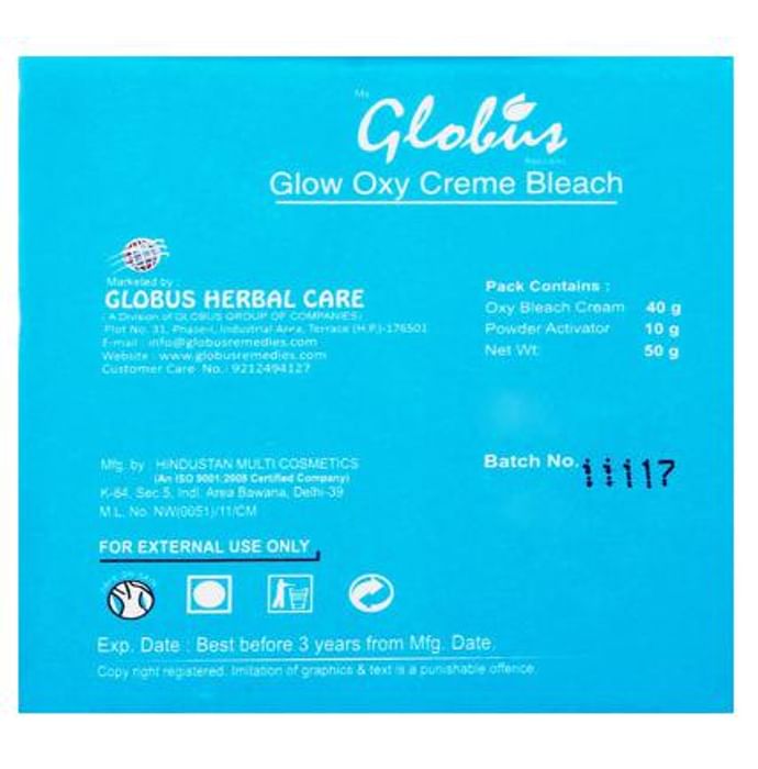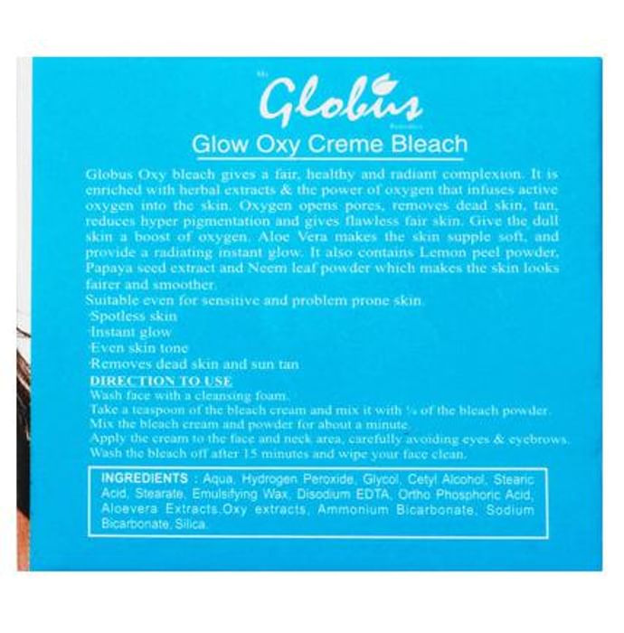 Globus Glow Oxy Creme Bleach Globus Glow Oxy Creme Bleach is formulated with the energy and glow of active oxygen that helps bleach visible facial hair to match the skin tone. It makes your skin look fairer and youthful with a radiant glow. It contains active oxygen is rich in antioxidants and is skin-friendly, pure, natural and made using herbal ingredients promoting improved complexion.