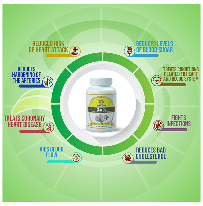 Good Health Garlic Veg Capsule is formulated to improve the overall health of an individual. It embodies antioxidant properties and also improves the immunity level of the body. In addition to this, it contains Garlic extract which is known to improve the cardiovascular health. | Key Ingredients: Garlic Extract | Key Benefits: It assists in improving cardiovascular health Helps to strengthen the immune system of the body Useful in regulating blood sugar levels of the body Helps to improve cholesterol levels of the body Helps to reduce hardening of the arteries, reduce the risk of heart attack, and improve the blood flow Useful in treating bacterial, fungal, and parasitic infections | Directions For Use: As directed by the physician. | Safety Information: Read the label carefully before use Store in a cool dry place away from direct sunlight Keep out of reach of the children Use under medical supervision