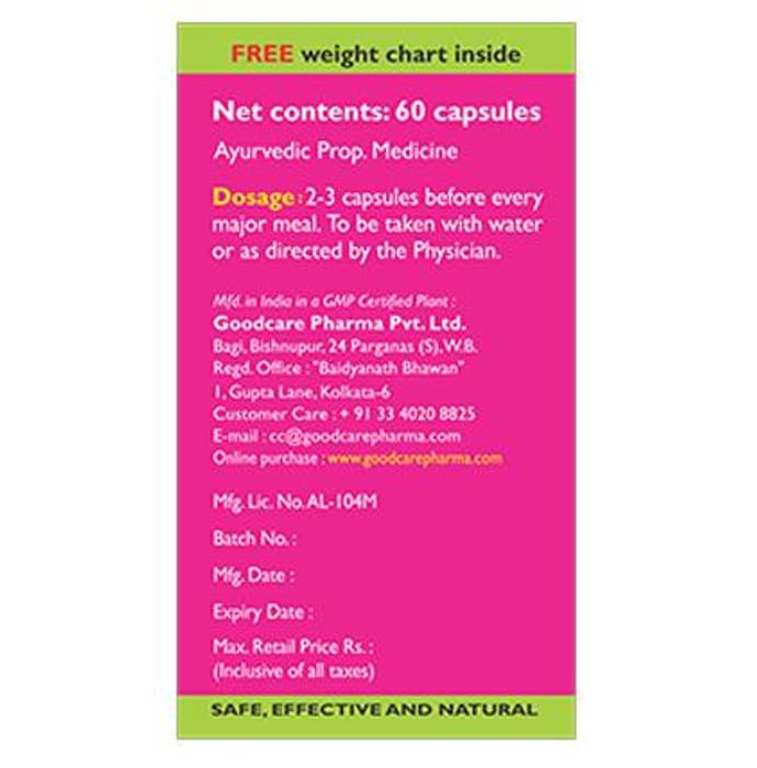 Goodcare Ezi Slim Plus Capsule Ezislim Plus Capsule contains Guggul, Kali Mirch, Lasun and Punarnava. Role of key ingredients: Guggul helps in burning excess fat, normalizes metabolism of lipid, and regulates triglyceride level and cholesterol in the body Kali Mirch accelerates metabolism and improves digestion. Lasun is effective in decreasing body fat. Punarnava works as a laxative and diuretic, and helps is getting rid of excess fat from the body. Ezislim Plus Capsule is an ayurvedic formulation that aids in fat reduction. It also enhances secretion of digestive enzymes and improves digestion. Directions of use: 2 capsules to be taken before lunch & dinner. Use under medical supervision.