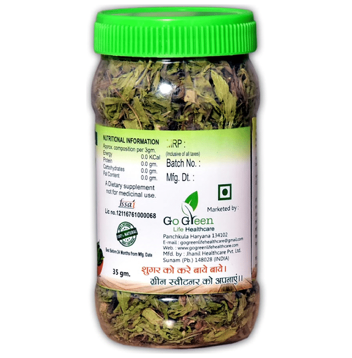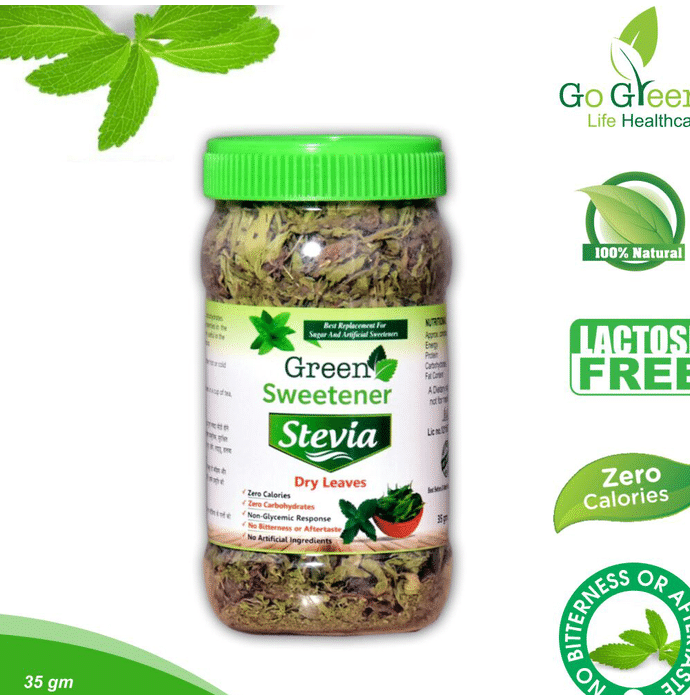 Green Sweetener Stevia Dry Leaves are a natural sweetener which is very low in calories. It is extracted from the Stevia plant and is used to provide a sweet taste in food and beverages. This has been used as a substitute for sugar which helps in keep many side effects of sugar away.Stevia or Steviol glycosides have zero calories. Stevia-based tabletop sweeteners can have zero or minimal calories per serving, depending upon the other food ingredients with which they are combined. | Key Ingredients: Stevia or Steviol glycosides | Key Benefits: It has a positive effect on those looking to control weight or manage diabetes It helps to reduce energy intake without sacrificing taste | Directions For Use: Take Green Sweetener Stevia Dry Leaves as desired. | Safety Information: Read the label carefully before use Do not exceed the recommended dose Keep out of the reach of children Store in cool and dry place Should be protected from direct light