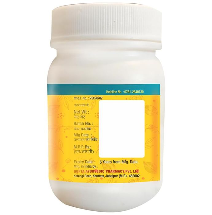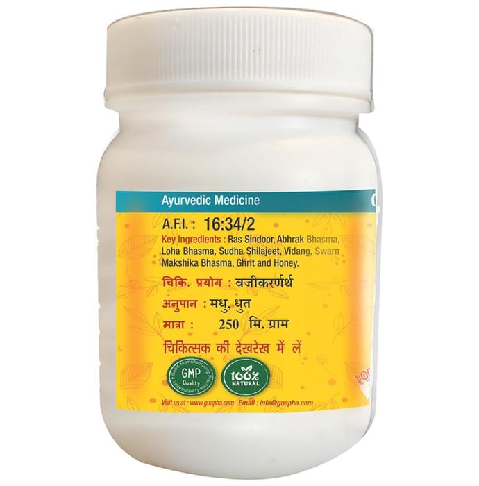 Guapha Ayurveda Purnachandra Ras (Plain) is an Ayurvedic medicine in tablet or powder form. It may help in treatment of sexual disorders. This medicine contains heavy metal ingredients, hence should only be taken under strict medical supervision. It is used in the Ayurvedic treatment of sexual disorders and may provide relief in low stamina, premature ejaculation. | Key Ingredients: Ras Sindoor Abhrak Bhasma Loha Bhasma Sudha Shilajeet Vidang (Embelia ribes) Swarn Makshika Bhasma Ghrit Honey | Key Benefits: It may help in the management of Sexual disorder May assist in the treatment of Premature Ejaculation Useful in improving the stamina level of the body Helps to balance Vata and Pitta Provides relief in the case of excessive urination at night | Directions For Use: 1 tablet (250mg) in the morning and evening with milk or as directed by the physician. | Safety Information: Read the label carefully before use Store in a cool dry place away from direct sunlight Keep out of reach of the children Use under medical supervision Do not exceed the recommended dose