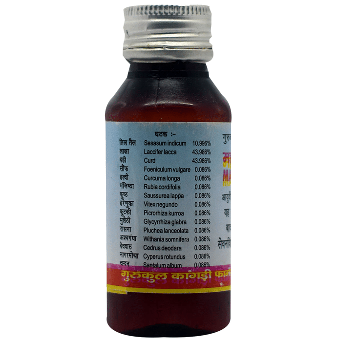 Gurukul Mahalakshadi Tel is an Ayurvedic medicine. It is a herbal oil, used in the treatment of low backache, spondylosis, pruritus, chronic fever etc. | Key Ingredients: Til oil Saunf Manjishtha Haldi Mulethi Kutki | Key Benefits: It is used in the treatment of low backache, sciatica, spondylosis, rhinitis Offers relief from cold, cough, fever and itching Good for body development and blood improvement in children and elders Effect on Tridosha and helps balance Vata and kapha | Directions For Use: Use as directed on the label or as advised by your physician. | Safety Information: Read the label carefully before use Keep out of reach of children Store in a cool and dry place away from direct sunlight