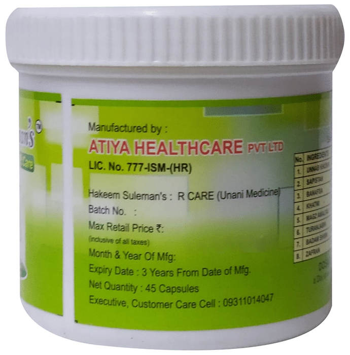 Hakim Suleman's R. Care Capsule Key Ingredients of Hakin Suleman's R. Care Capsule: Banafsha Unnab Khushk Sapistan Khatmi