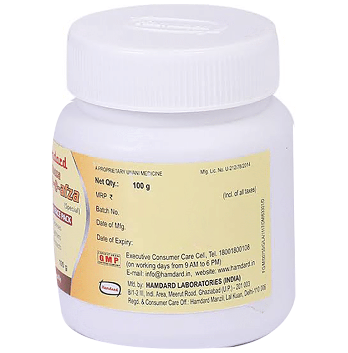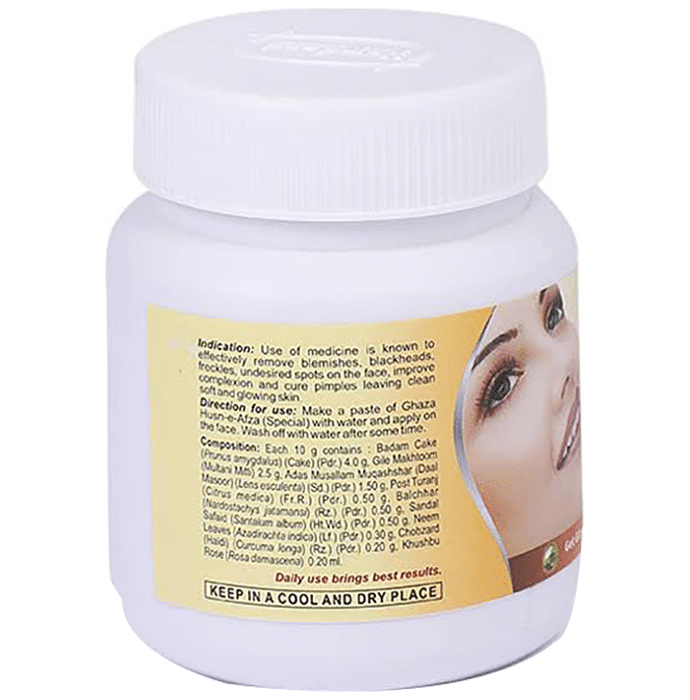 Hamdard Ghaza-Husn-e-Afza Herbal Face Pack is a perfect blend of skin rejuvenating and anti-ageing herbs and agents. This is highly effective in keeping the skin rejuvenated and glowing. | Key Ingredients: Badam Cake Gile Makhtoom (Multani Mitti) Adas Musallam Muqashshar (Daal Masoor) Post Turanj Balchhar Sandal Safaid Neem Leaves Chobzard ( Haldi) Khushbu Rose | Key Benefits: It has antibacterial and anti-fungal characteristics which help in healing acne It helps in regenerating skin cells It helps in ridding the skin of toxins It is useful in reducing tan | Directions For Use: Use as directed by the physician. | Safety Information: Read the label carefully Store in a cool and dry place Keep out of the reach of children