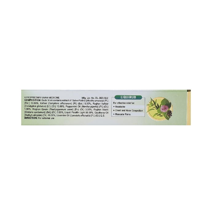 Hamdard Liquirub Liquirub is a highly effective Unani formulation for musculoskeletal disorders and congestion. It gives quick relief from headache, muscular pain, and chest or nasal congestion. It contains sat-e-pudina, which is a local anesthetic that helps provide relief from inflamed joints. Gaultheria oil has been used in topical analgesic and rubefacient preparations for the treatment of muscular pain. It also has peppermint oil that is used for topical application for relief from itching, muscular pain, and headache. It is a natural pain relief oil that benefits in various pain conditions with long-lasting effects. | Key Ingredients: Sat-e-Pudina (Menthol) Kafoor Roghan Asfidar (Nilgiri oil) Peppermint Oil | Key Benefits: Generally helpful in relieving joint pain It may also help with chest and nasal congestion Can also help with skin problems and headache | Directions For Use: Apply on affected area | Safety Information: Read the label carefully before use Store in a cool and dry place away from direct sunlight Keep out of reach of children For external use only
