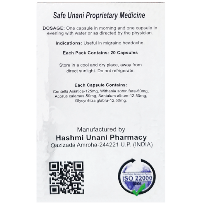 Hashmi Migrokill Capsule helps prevent migraine attacks and minimizes the frequency of nausea. It also improves overall body fitness. | Key Ingredients: Centella Asiatica Withania Somnifera Acorus Calamus Santalum Album | Key Benefits: Helps prevent migraine attack Minimizes the frequency of nausea | Directions For Use: Use as directed. | Safety Instructions: Read the label carefully before use Store in a cool dry place away from direct sunlight Keep out of reach of the children