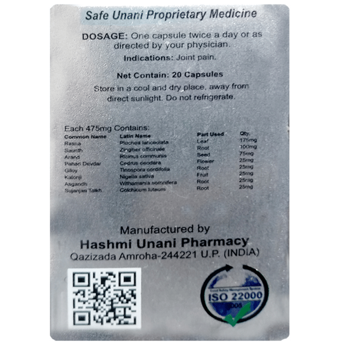 Hashmi Painazone Capsule is a blend of potent ingredients that help with joint pain. It relieves joints and reduces pain. | Key Ingredients: Rasna Saunth Anand Giloy Kalonji Asgandh | Key Benefits: Made with potent ingredients Relieves joint pain | Directions For Use: Use as directed. | Safety Instructions: Read the label carefully before use Store in a cool dry place away from direct sunlight Keep out of reach of the children