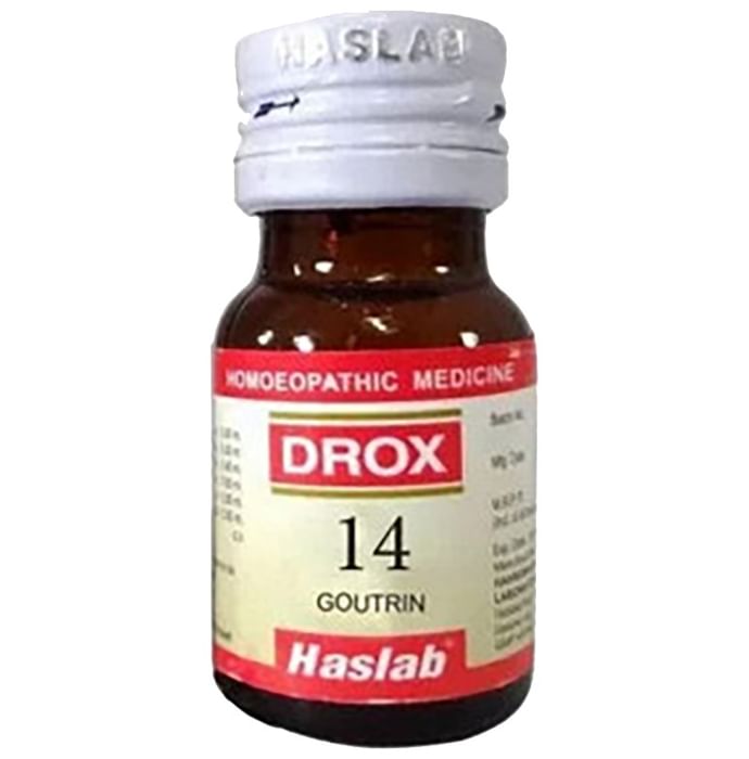 Haslab Drox 14 Goutrin Drop is indicated during acute and chronic gout, gout with swollen and stiff joints, shooting pain and arthritis. | Key Ingredients: Acid benz 3x Ledum Pal 3x Urticaurens 3x Colchicum 3x Guiacum 3x | Key Benefits: Helps in treatinggout, gouty paroxysm, gout with swollen and stiff joints Treats arthritis, arthritis deformans, tearing pains in small joints with contractions and shifting pains Drops helps in reducing severe pain and swelling Reduces inflammation of the muscular tissue Treats problems associated with periosteum and synovial membranes | Directions For Use: 5 to 10 drops in little water 3 to 4 times in a day or as prescribed by the physician | Safety Information: Read the label carefully before use Do not exceed the recommended dose Keep out of the reach of children
