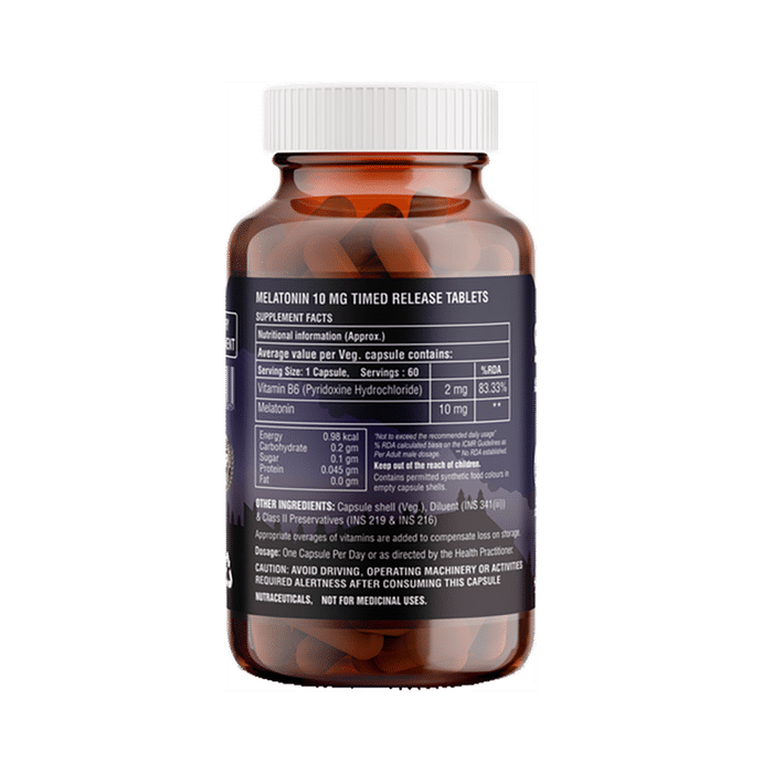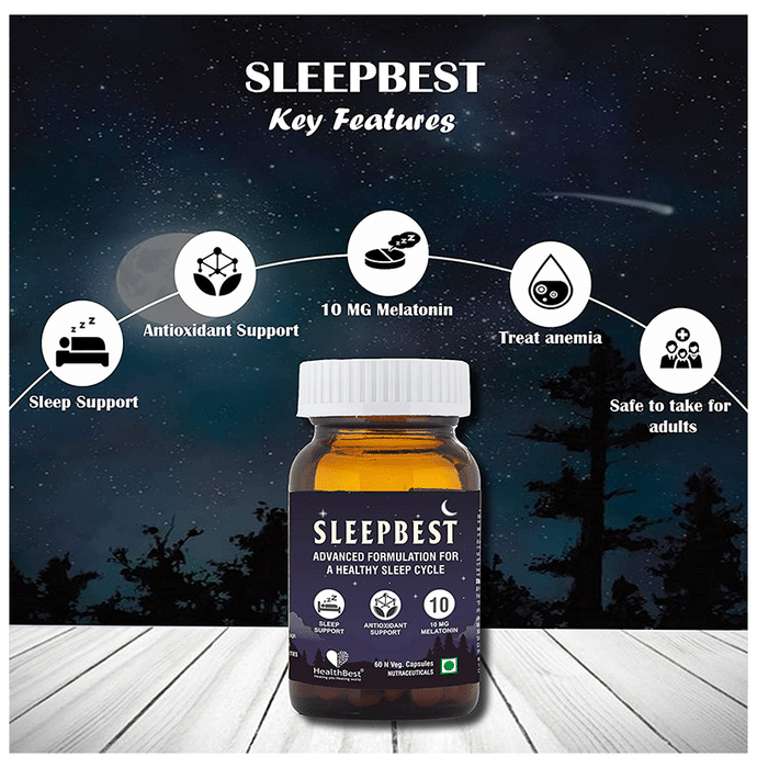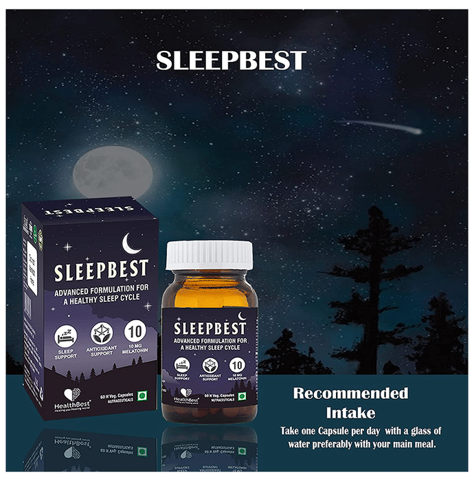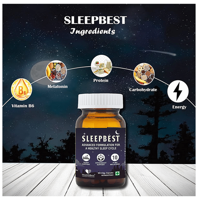 HealthBest Sleepbest Veg Capsule is a formulation that helps promote deep relaxation and calmness. Release all the tension of a hard day at work faster. Melatonin and Vitamin B6 tablets are a natural way to treat the symptoms of insomnia. Many times melatonin's cycle of production and release is disrupted. Melatonin supplements could be used in such cases and are safe to take for adults. Vitamin B6 is used for isoniazid-induced peripheral neuritis, idiopathic sideroblastic anaemia and Vitamin B6 deficiency states. | Key Ingredients: Melatonin 10 mg Vitamin B6 2 mg Protien Carbohydrates Energy | Key Benefits: Sleepbest veg capsule helps to get sound sleep These capsules promotes deep relaxation and calmness This product aids to treat the symptoms of insomnia It helps to balance your hormones and combat stress It acts as a brain tonic and helps improve memory and brain functions It can help reduce anxiety and stress also aids to fight depression | Directions for use: Take 1-2 Capsules daily with a full glass of water preferably with the main meal or as directed by a health expert. | Safety Information: Protect it from direct sunlight, heat and moisture Do not use if seal is broken Keep out of reach of children Store it in a cool, dark and dry place For external use only Kindly consult your physician before using it