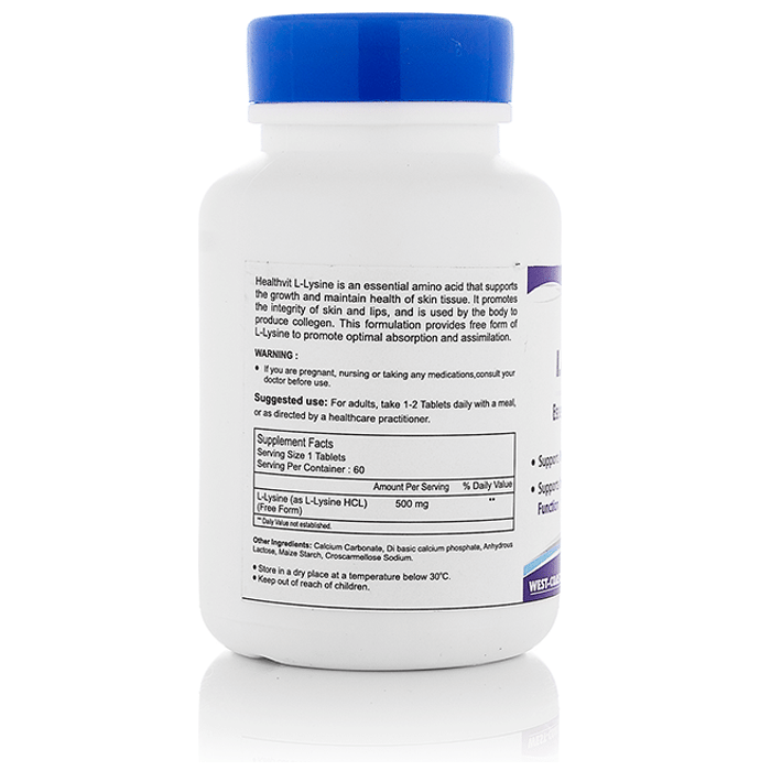 HealthVit L-Lysine 500mg Essential Amino Acid Tablet Healthvit L-Lysine 500mg tablets contain L-Lysine as its active ingredient. Lysine is used for the health and integrity of skin. Key benefits of Healthvit L-Lysine 500mg tablets: Supports membrane health, Supports immune system function. Lysine is an amino acid that cannot be made by the body so its an essential amino acid. It is also used for preventing and treating cold sores. Direction to use: For adults: Take one tablet two times daily with a meal. Safety information: Pregnant, nursing women or individual taking any medications, consult the doctor before use. No artificial colours, flavours or preservatives added, no chemical solvents. Keep out of reach of children. Use under medical supervision.
