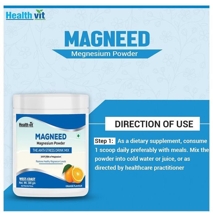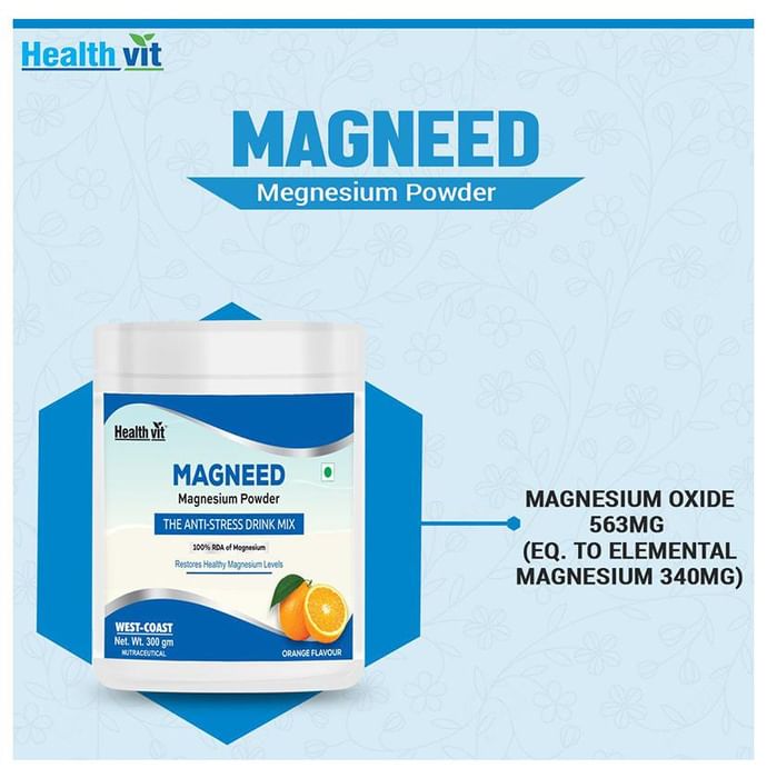 HealthVit Magneed Magnesium Powder Orange HealthVit Magneed Magnesium Powder Orange is an anti-stress mix. It contains magnesium and helps to metabolize fats, carbohydrates and proteins. It also supports proper muscle function. The supplement is responsible for normal muscle and nerve function.