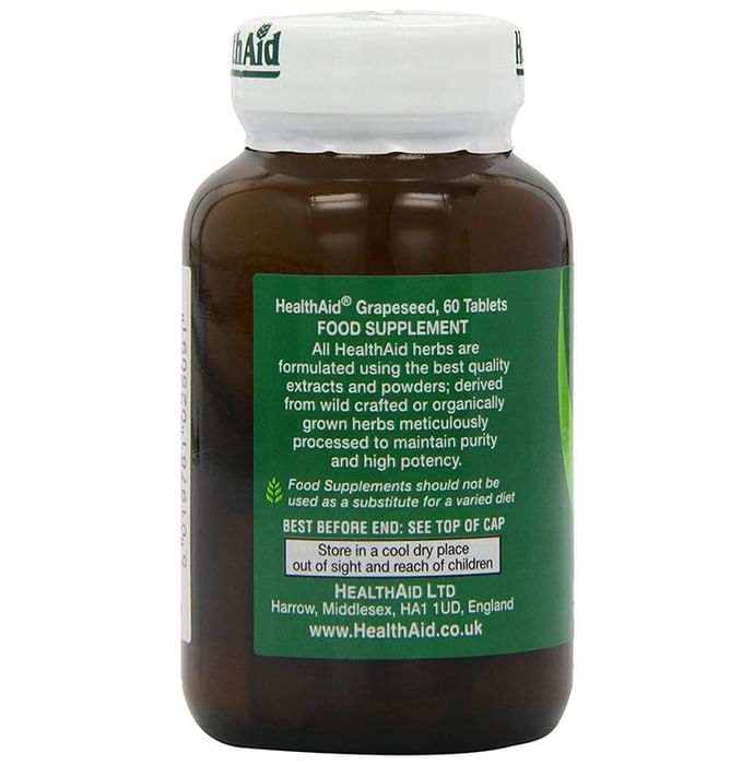 Healthaid Grapeseed Tablets are formulated using the best quality extracts and powders,derived from wild crafted or organically grown herbs meticulously processed to maintain purity and high potency. Health Aid Grapeseed extract has grape seeds that act as a powerful antioxidant and is great for heart and also for general all round health. Health Aid Grapeseed extract is a source of essential fatty acids. It has essential antioxidant properties to aid in prevention of free radical damage.Health Aid Grapeseed extract helps in maintaining healthy liver function and enhances circulation and skin tone and elasticity. It might also help in regulating blood sugar levels. Key Benefits: Rich in natural antioxidants Delays the onset of ageing Enhances skin tone and elasticity Direction of use: Adults and children over 12 years of age, two to three tablets daily or as advised by a suitably qualified person. Use under medical supervision