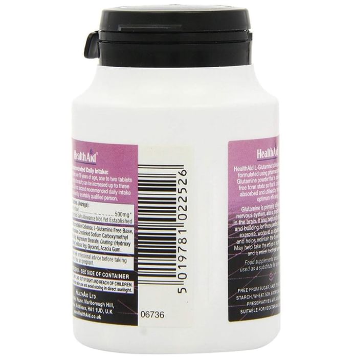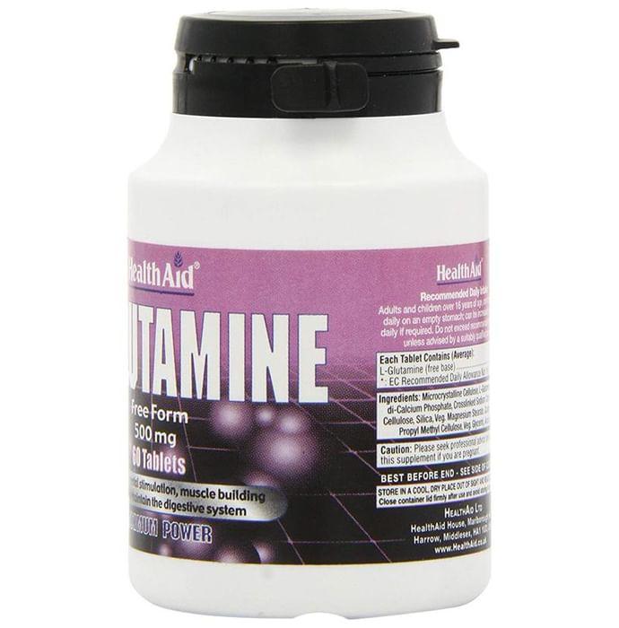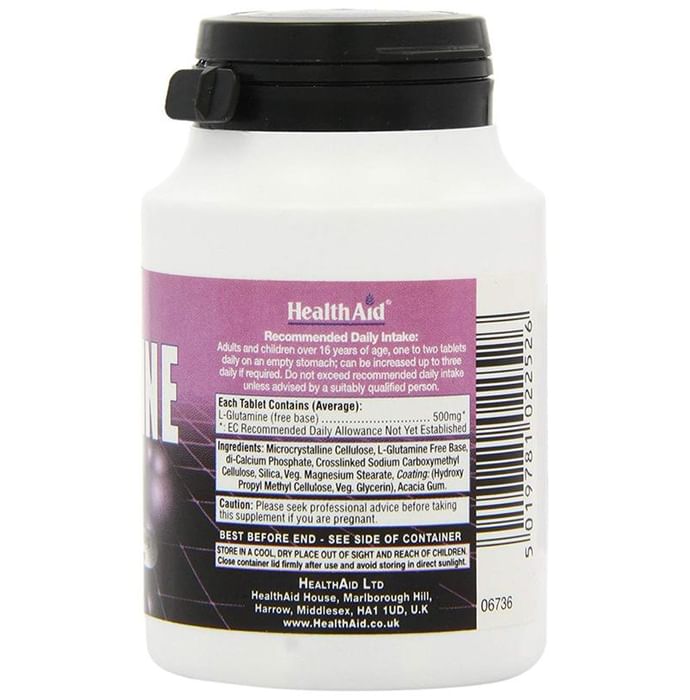 Healthaid L-Glutamine 500mg Tablet Healthaid L-Glutamine Tablet contain L-Glutamine are specially formulated using pharmaceutical grade Glutamine powder that is pure and in it’s free form, so that it can be readily absorbed and utilised by the body for optimum efficiency. Glutamine can readily pass the blood-brain barrier. It helps sustain proper brain function & mental activity by helping to clear ammonia from the tissues, especially brain tissue. Key Benefits: Athletes People who gym or exercise often Those who wish to maintain a healthy body weight Those wishing to reduce alcohol craving People who wish to maintain a healthy immune system key Ingredients- L-Glutamine, Di-Calcium Phosphate, Acacia Gum, Magnesium, Sillica. Direction of use: Adults and children over 16 years of age, one capsules daily with breakfast. Do not exceed recommended daily intake unless advised by a suitably qualified person. Use under medical supervision